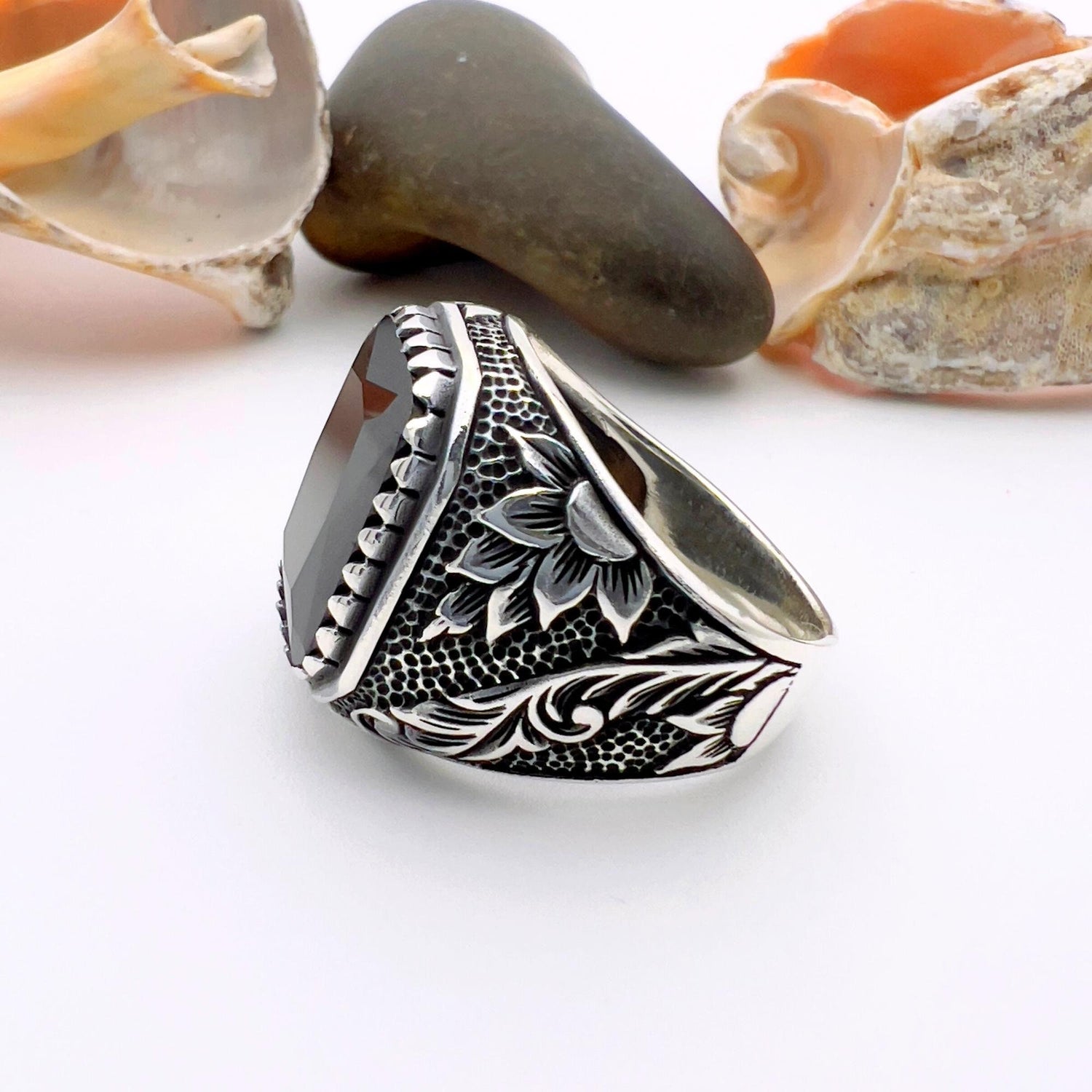 كل خاتم هو شهادة على الحرفية التركية التقليدية، مصمم بعناية من الفضة الإسترلينية 925 لضمان المتانة واللمعان الرائع. الحجر المركزي يتميز بـ العقيق الأسود الطبيعي اللافت، المعروف بلونه العميق والغني وخصائصه الرمزية، مما يجعله إكسسوارًا قويًا يعبر عن شخصية. الوزن التقريبي: 15 ± جرام، قد يختلف قليلاً حسب حجم الخاتم، مما يعكس إحساسه الجوهري وجودته الممتازة.