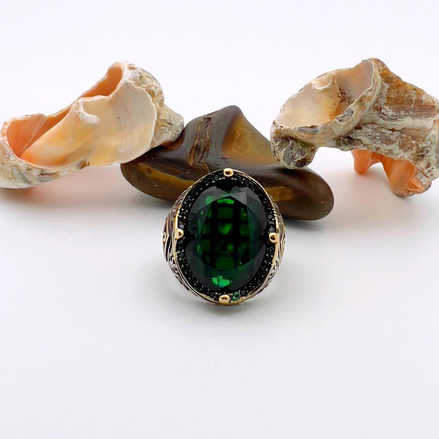 خاتم عثماني تركي مصنوع يدويًا للرجال | زمرد أخضر بيضاوي فضة استرلينية