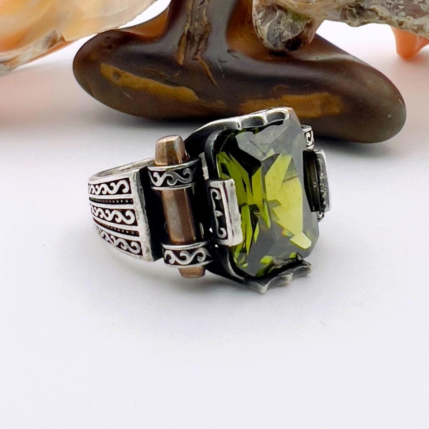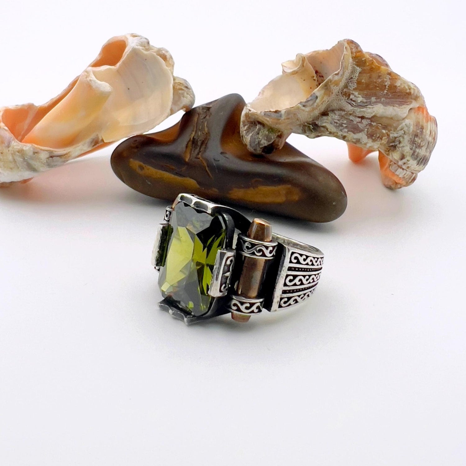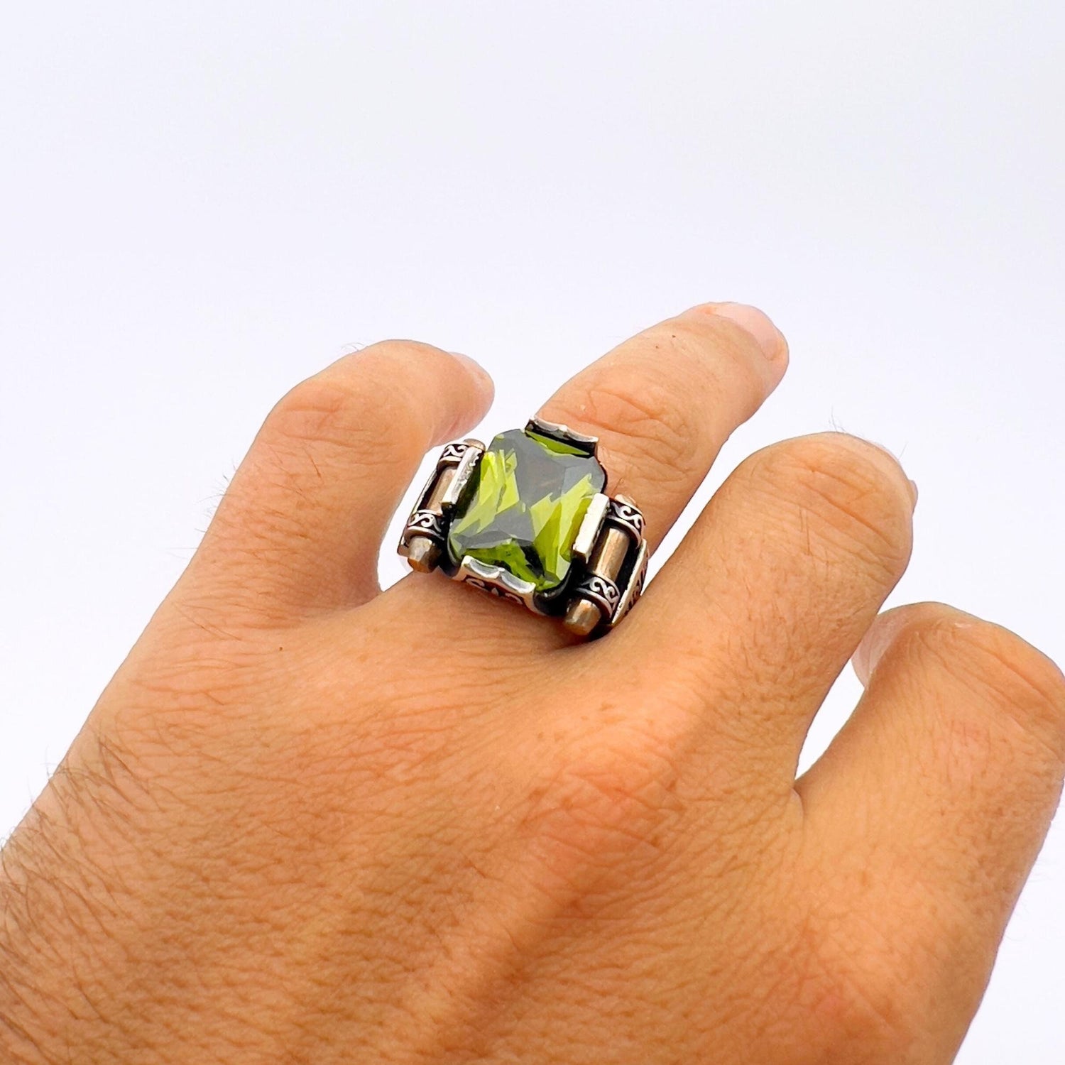 اكتشف الأناقة التي لا مثيل لها والسحر التاريخي مع خاتمنا الفضي الرائع بحجر بيريدوت الأخضر، عمل فني تركي مصمم للرجل المميز.