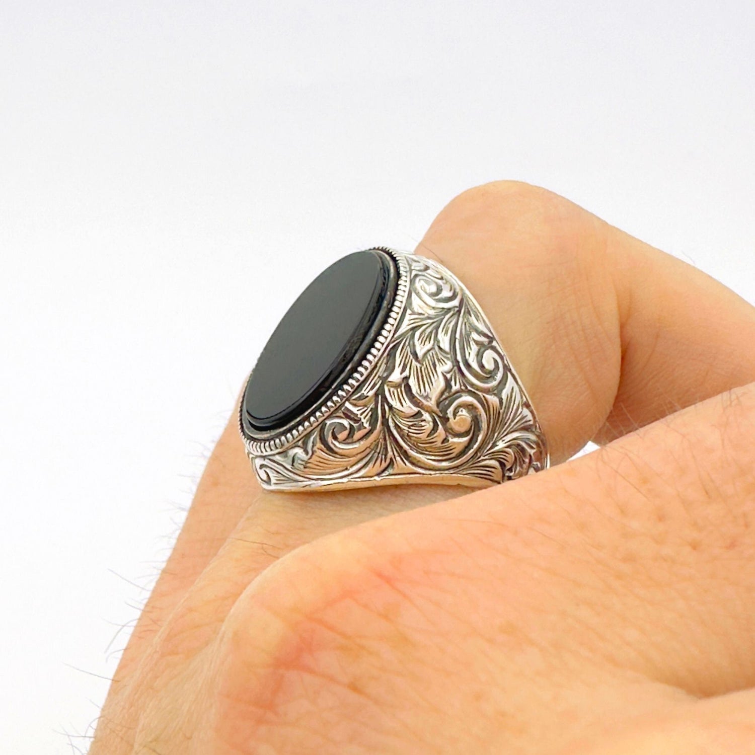 خاتم رجالي يدوي الصنع من الفضة الإسترلينية 925 بأونيكس بيضاوي - الطراز العثماني