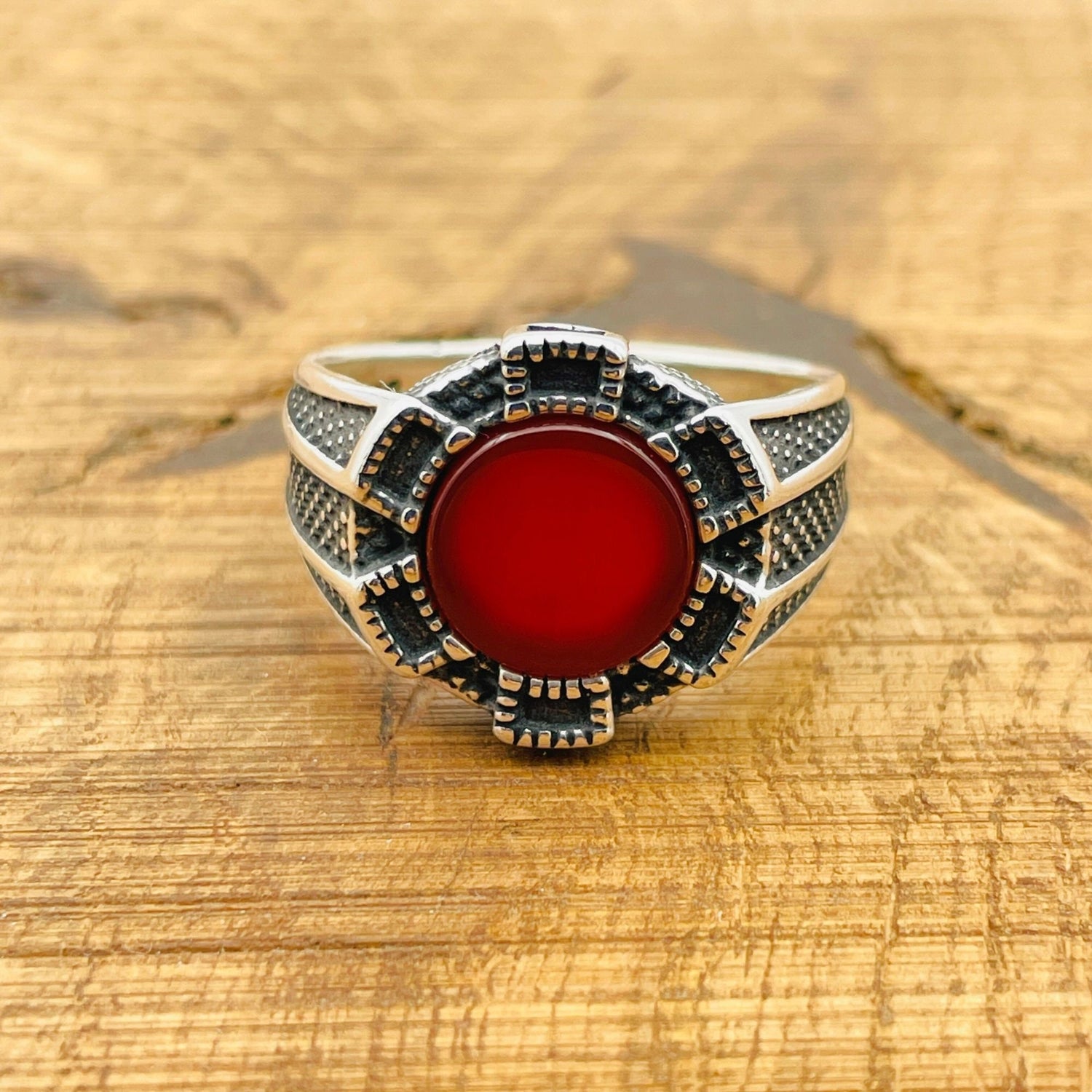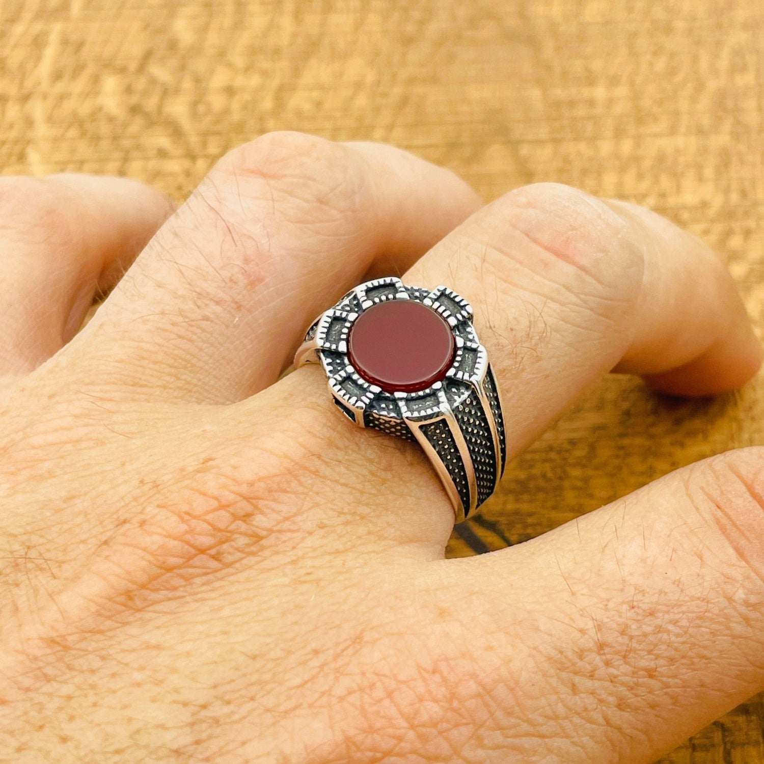 اكتشف الجاذبية الساحرة لخاتم الرجال اليدوي الصنع بحجر العقيق الأحمر البيضاوي، تحفة من الحرفية التركية مصممة لتلفت الأنظار. يجمع هذا القطعة المميزة بين الأناقة الخالدة والحضور الرجولي الجريء، مثالي للرجل المميز.