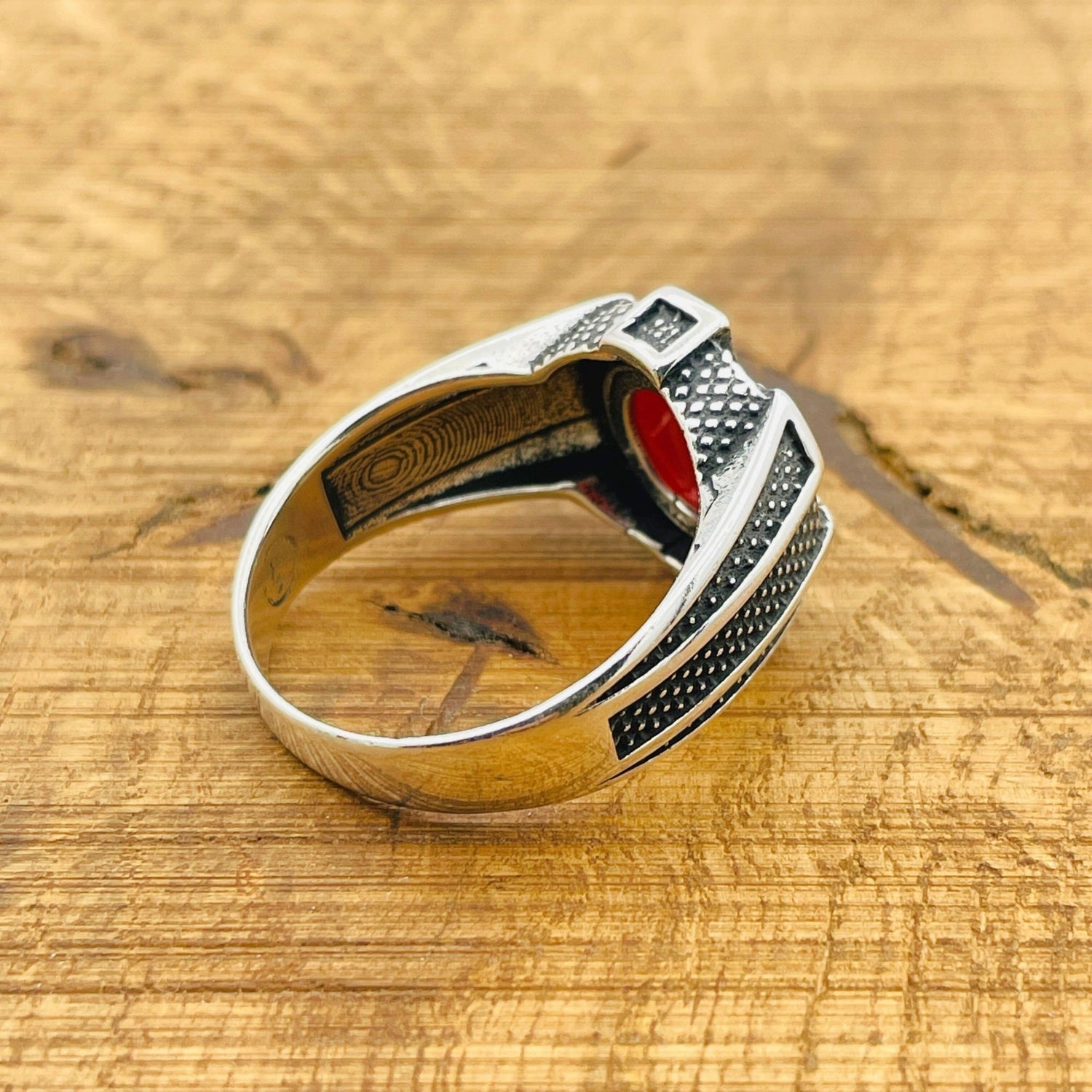 خاتم رجالي تركي مصنوع يدويًا من الفضة الإسترلينية مع حجر عقيق أحمر بيضاوي جريء - هدية مصنوعة يدويًا له