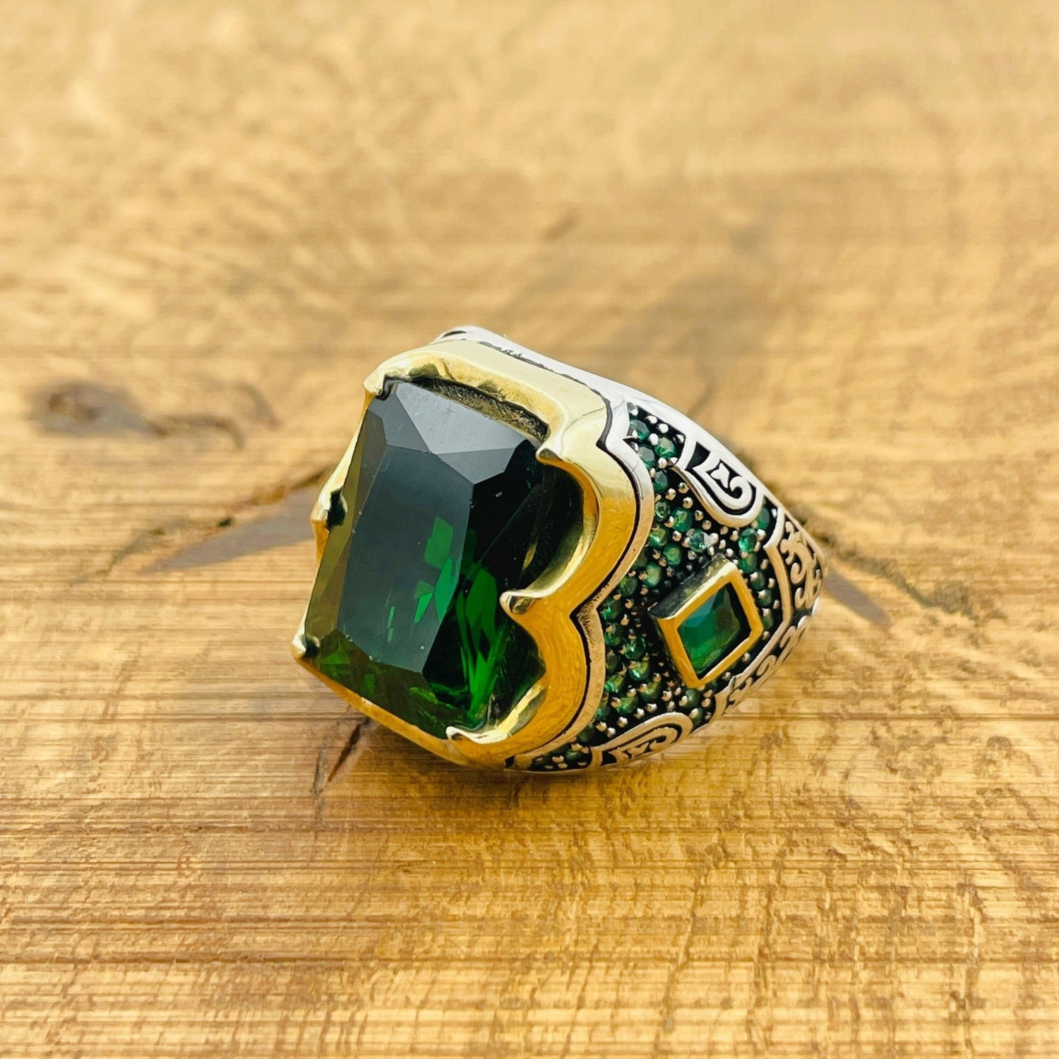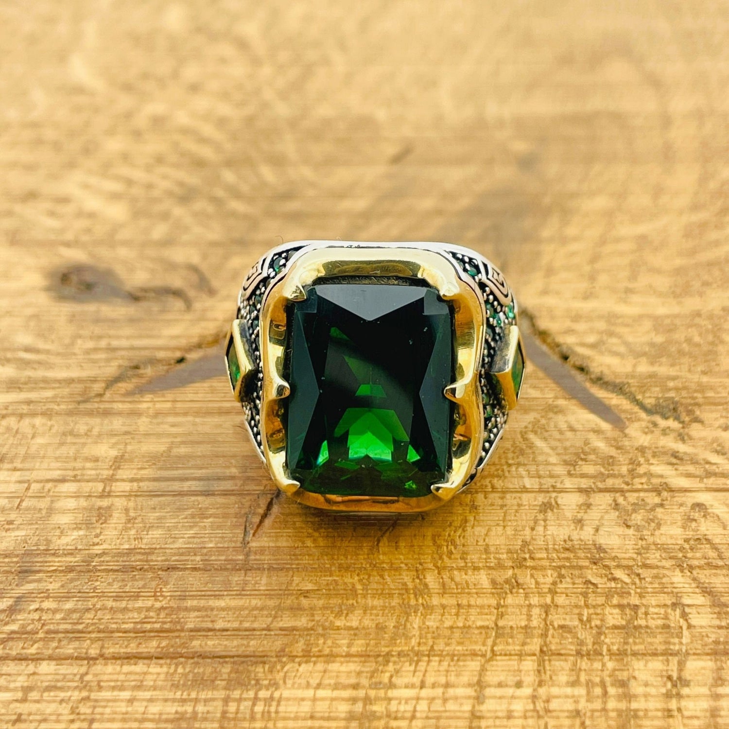 خاتم رجالي مربع يدوياً تركي من الفضة الإسترلينية 925 مع زمرد