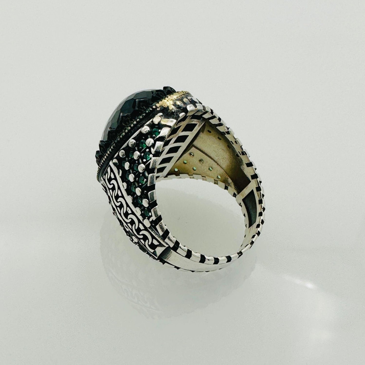 خاتم رجالي مصنوع يدويًا من الفضة الإسترلينية 925 - مجوهرات حجر الزركون الأخضر البيضاوي العتيقة