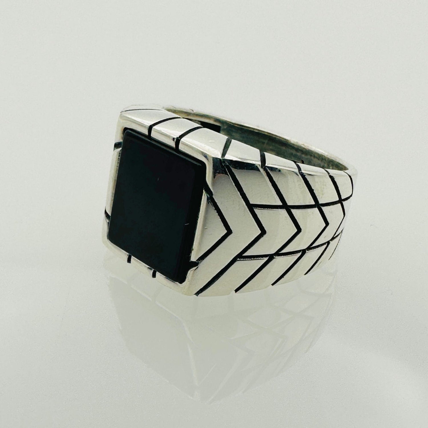 كل خاتم هو شهادة على الحرفية التركية الأصيلة، مصنوع بعناية يدوياً من الفضة الإسترلينية 925 عالية الجودة. يتميز بحجر عقيق أسود طبيعي مذهل، معروف ببريقه العميق وجاذبيته الخالدة. التصميم المربع البسيط اللافت يقدم مظهراً معاصراً وكلاسيكياً في آن واحد، مما يجعله إضافة متعددة الاستخدامات لأي خزانة ملابس.