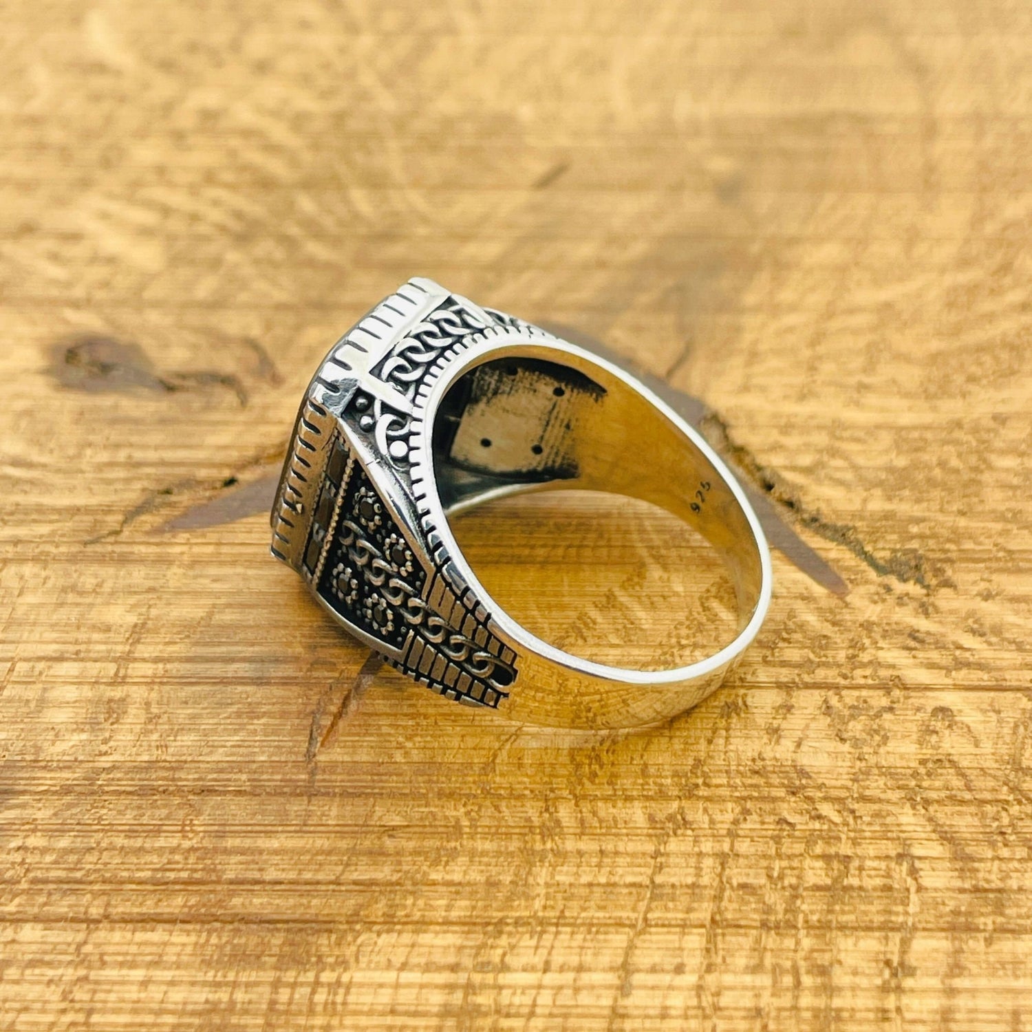 خاتم مربع من الفيروز الأسود للرجال مصنوع يدوياً من الفضة الإسترلينية 925 التركية الأصلية