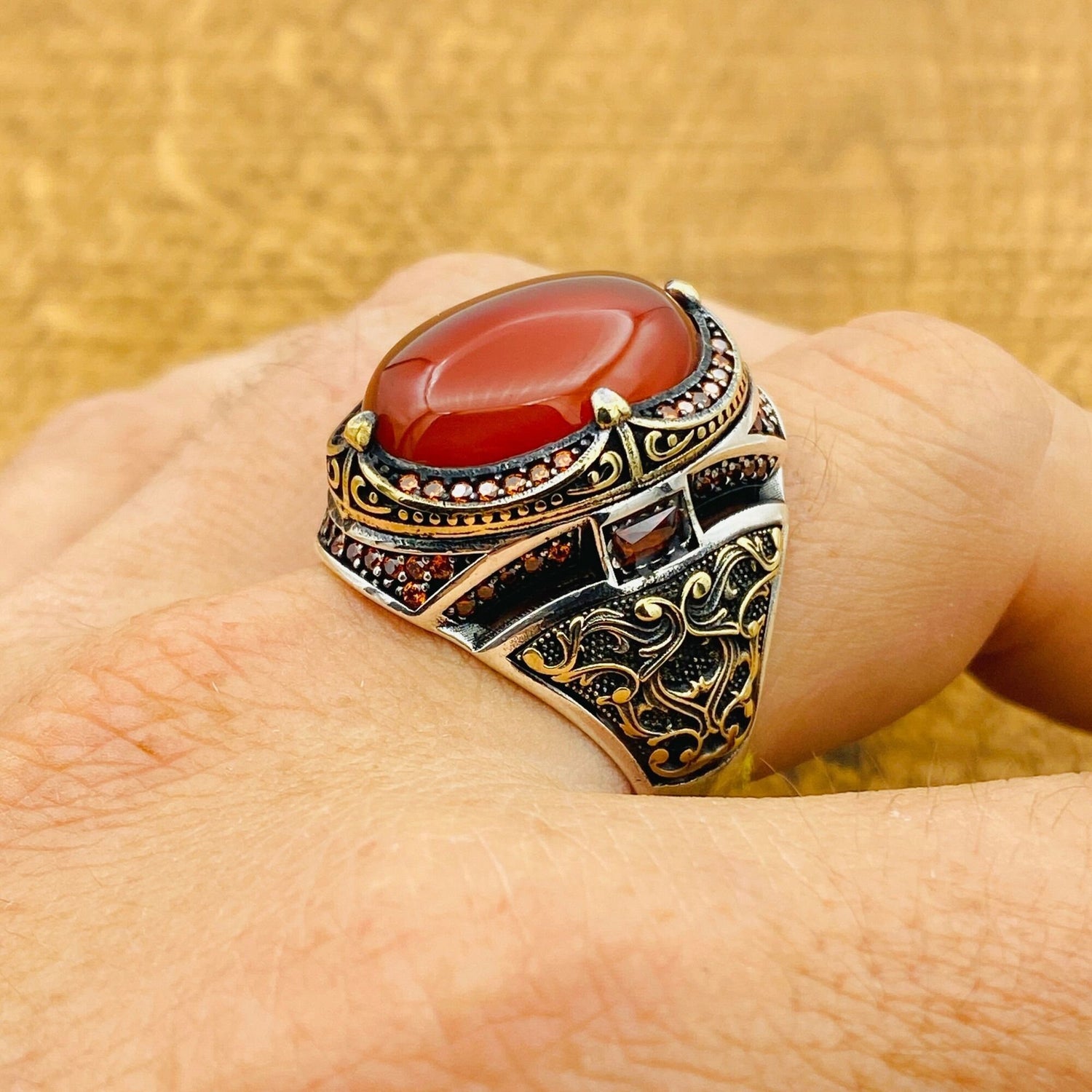 خاتم عثماني تركي أصلي للرجال من العقيق الأحمر الفضي الإسترليني 925