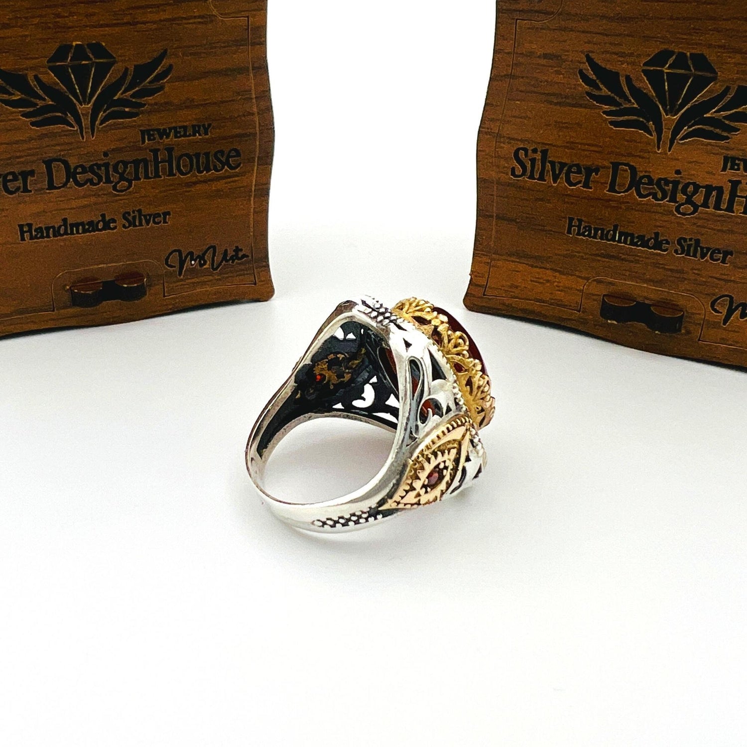 خاتم فضة استرلينية للرجال من العقيق الأحمر مصنوع يدوياً | مجوهرات بيان على الطراز العثماني