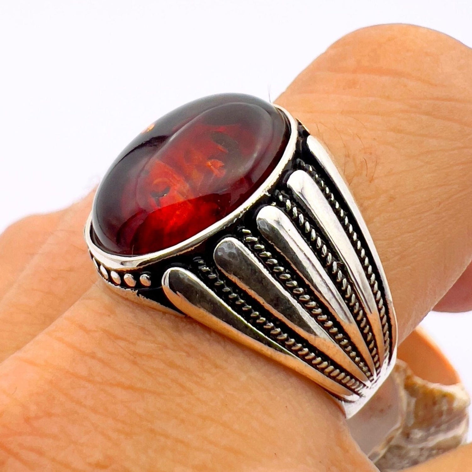 خاتم رجالي فريد مصنوع يدويًا من الفضة الإسترلينية التركية 925 مع كهرمان أحمر بارز