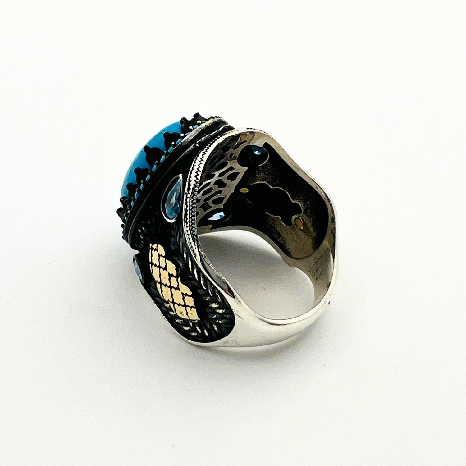 يتميز هذا الخاتم اللافت بحجر تركواز مذهل في إعداد بيضاوي كلاسيكي، مختار بسبب لونه الجذاب وجماله الطبيعي. مصنوع ببراعة من الفضة الإسترلينية 925 الفاخرة، ويعد بأناقة دائمة وإحساس فاخر. يزن حوالي 16.5 جرام مع حجم رأس سخي 18x23 مم، ويوفر حضوراً مريحاً لكنه قوي.