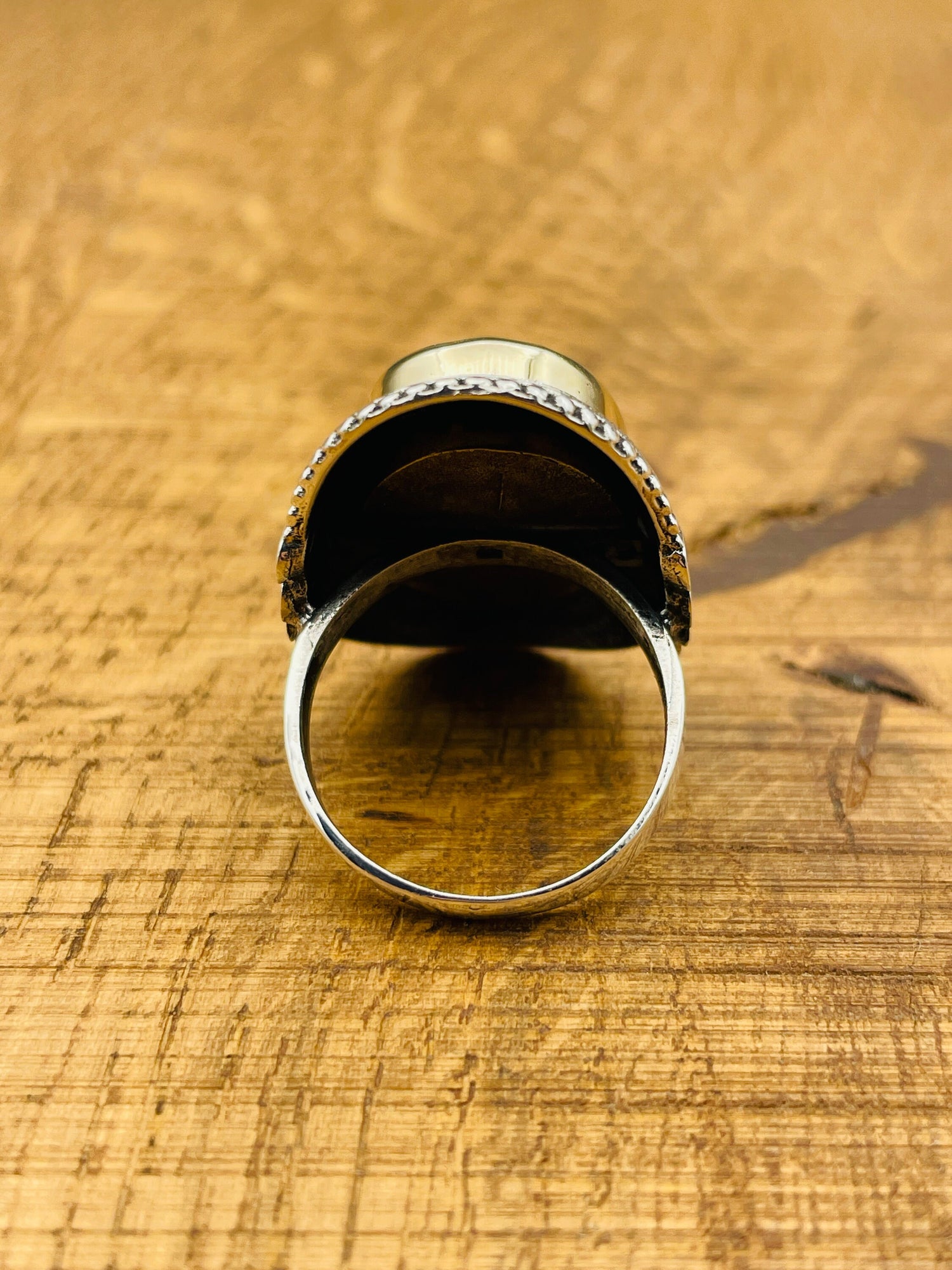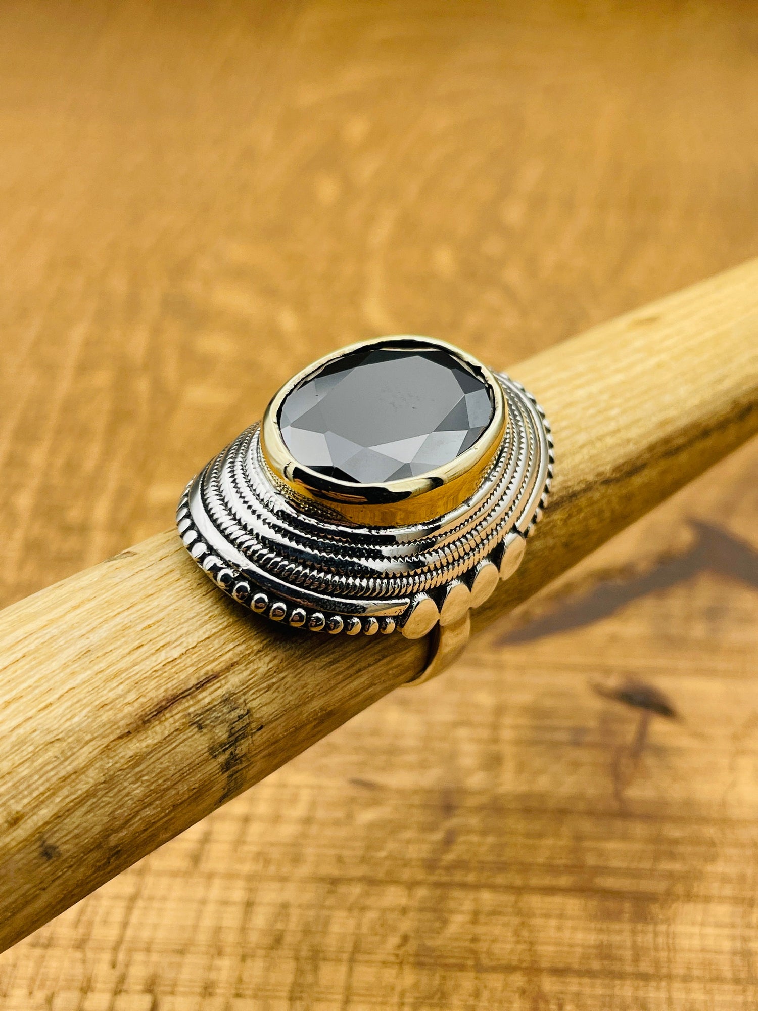 يتميز هذا الخاتم الرائع بحجر العقيق الأسود الجريء والبارز، موضوع بشكل مثالي داخل تصميم عثماني معقد. مصنوع بخبرة من الفضة الإسترلينية 925 عالية الجودة، مما يوفر المتانة واللمعان الفاخر. بحجم رأس كبير يبلغ 20مم × 30مم ووزن تقريبي 15جم، يجعل هذا القطعة تأثيرًا كبيرًا.