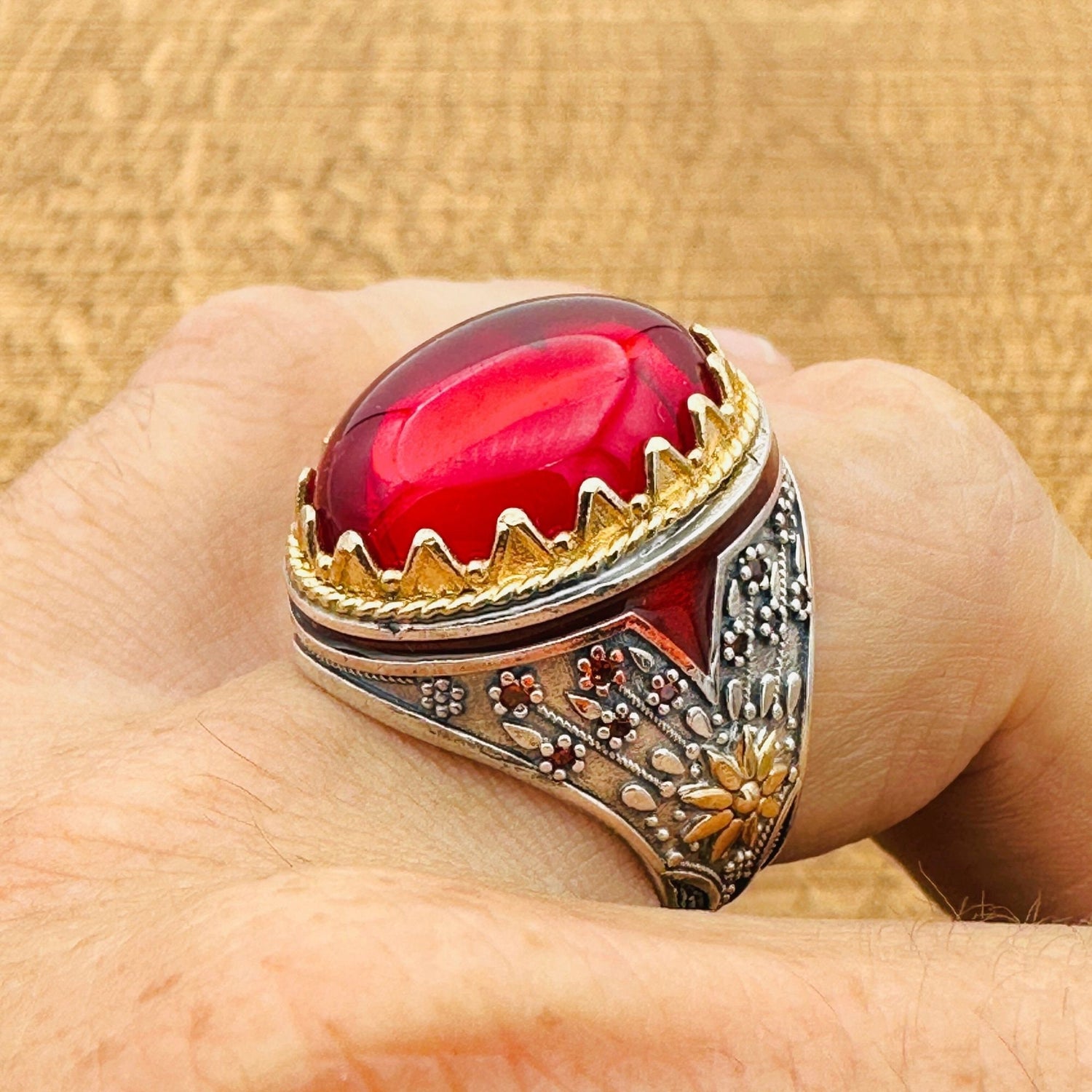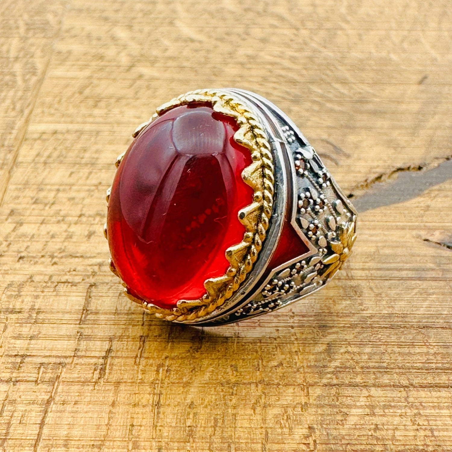 خاتم رجالي بيضاوي من العقيق الأحمر والسترلينغ الفضي 925 على الطراز العثماني اليدوي الرائع