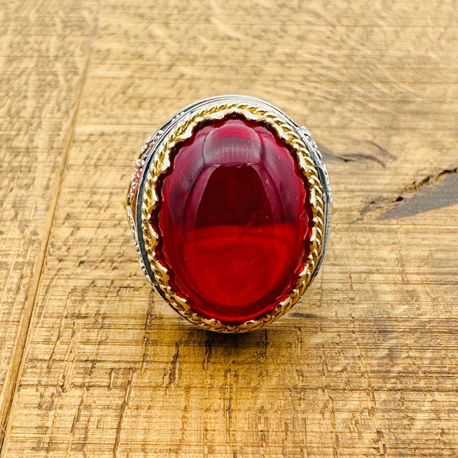 ادخل عالم الأناقة الخالدة والتفرد الجريء مع هذا الخاتم الرائع من عقيق التوباز الأحمر البيضاوي، تحفة مصممة للرجل المميز الذي يقدر الحرفية والأسلوب الفريد. مثالي لإضافة لمسة من العظمة لأي طقم أو كهدية ذات معنى.