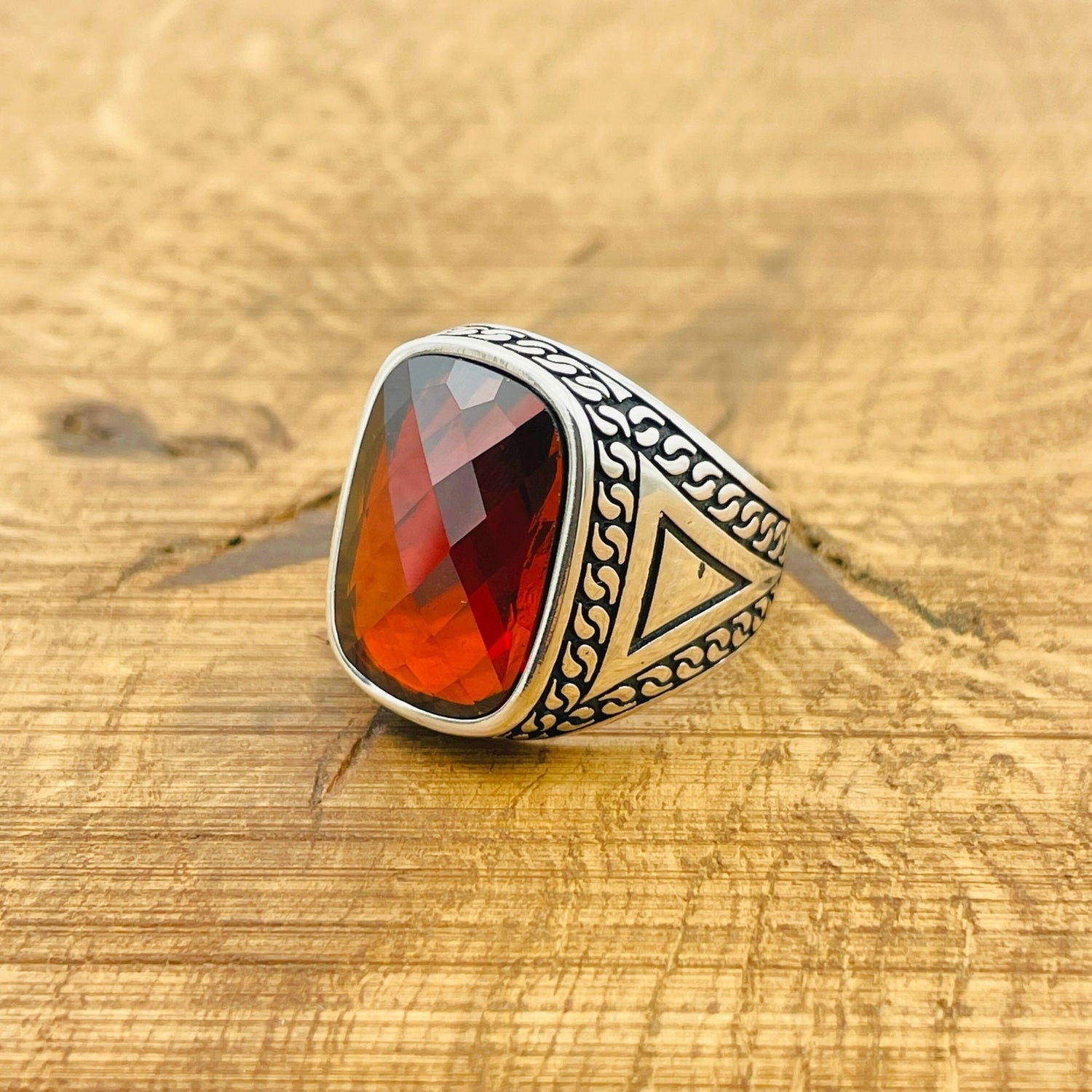 خاتم رجالي مصنوع يدويًا من الفضة الإسترلينية التركية 925 | زركون أحمر مربع عتيق