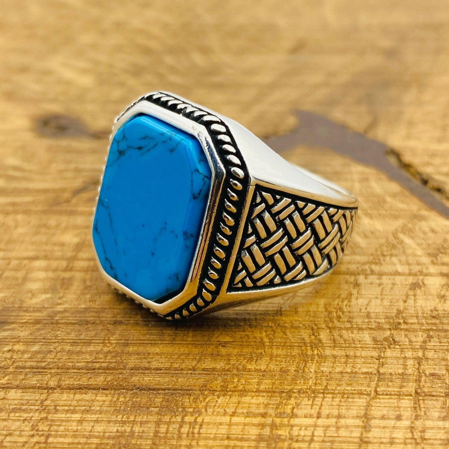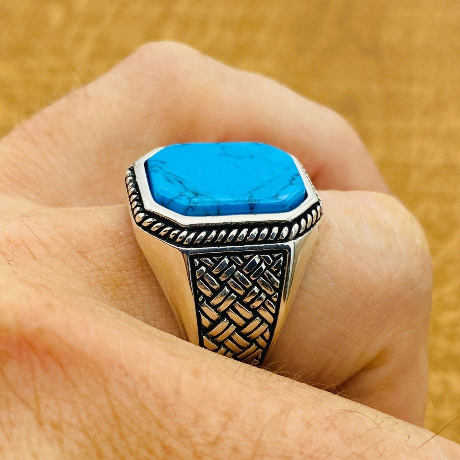 خاتم تركي يدوي من الفضة الإسترلينية مع الفيروز للرجال | هدية حجر كريم 925 فنية