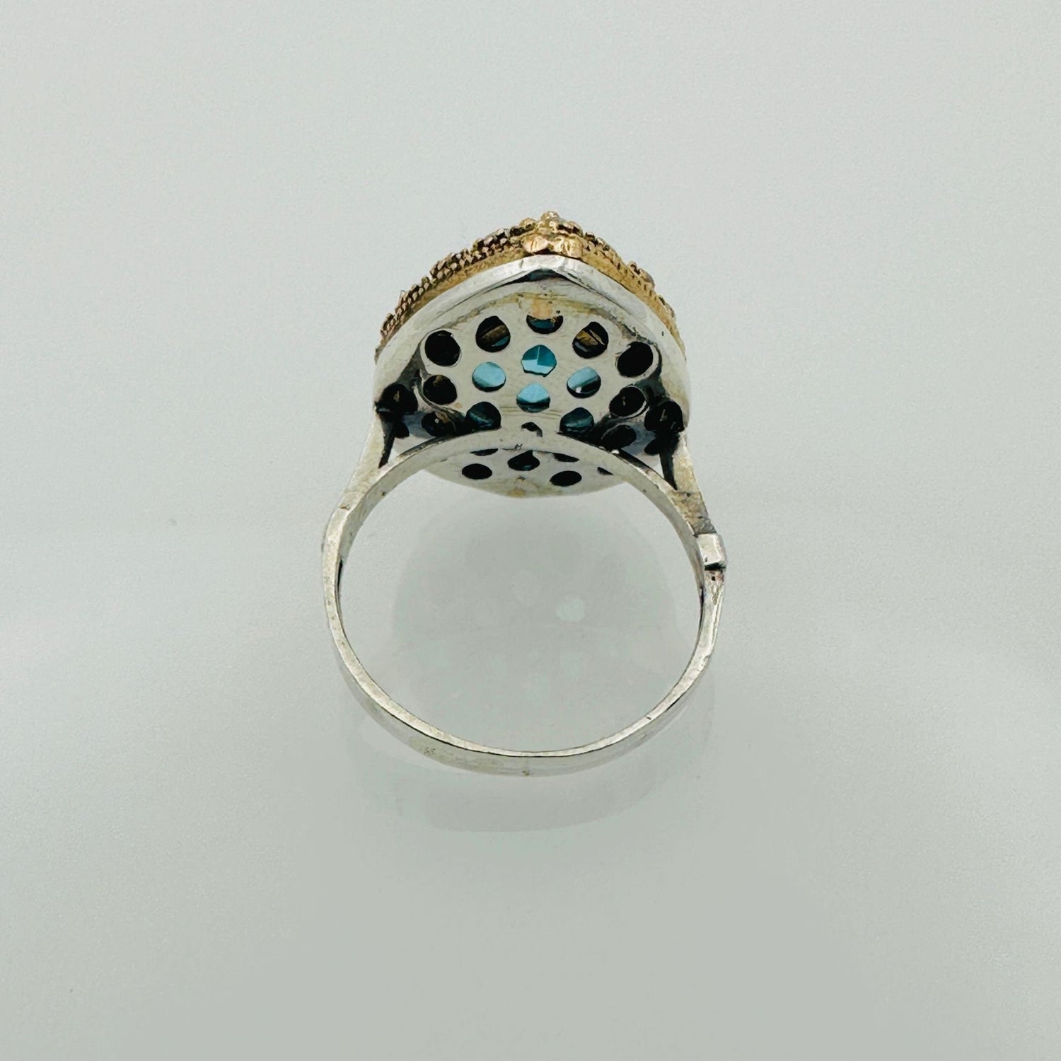 انغمس في الجمال المتلألئ والفن الراقي لهذا الخاتم الفضّي بحجر الأكوامارين، قطعة مصممة لترتقي بأي زي وترمز إلى حب عميق. اختبر فرحة امتلاك تحفة يدوية الصنع تتألق حقًا بالأناقة والرقي.