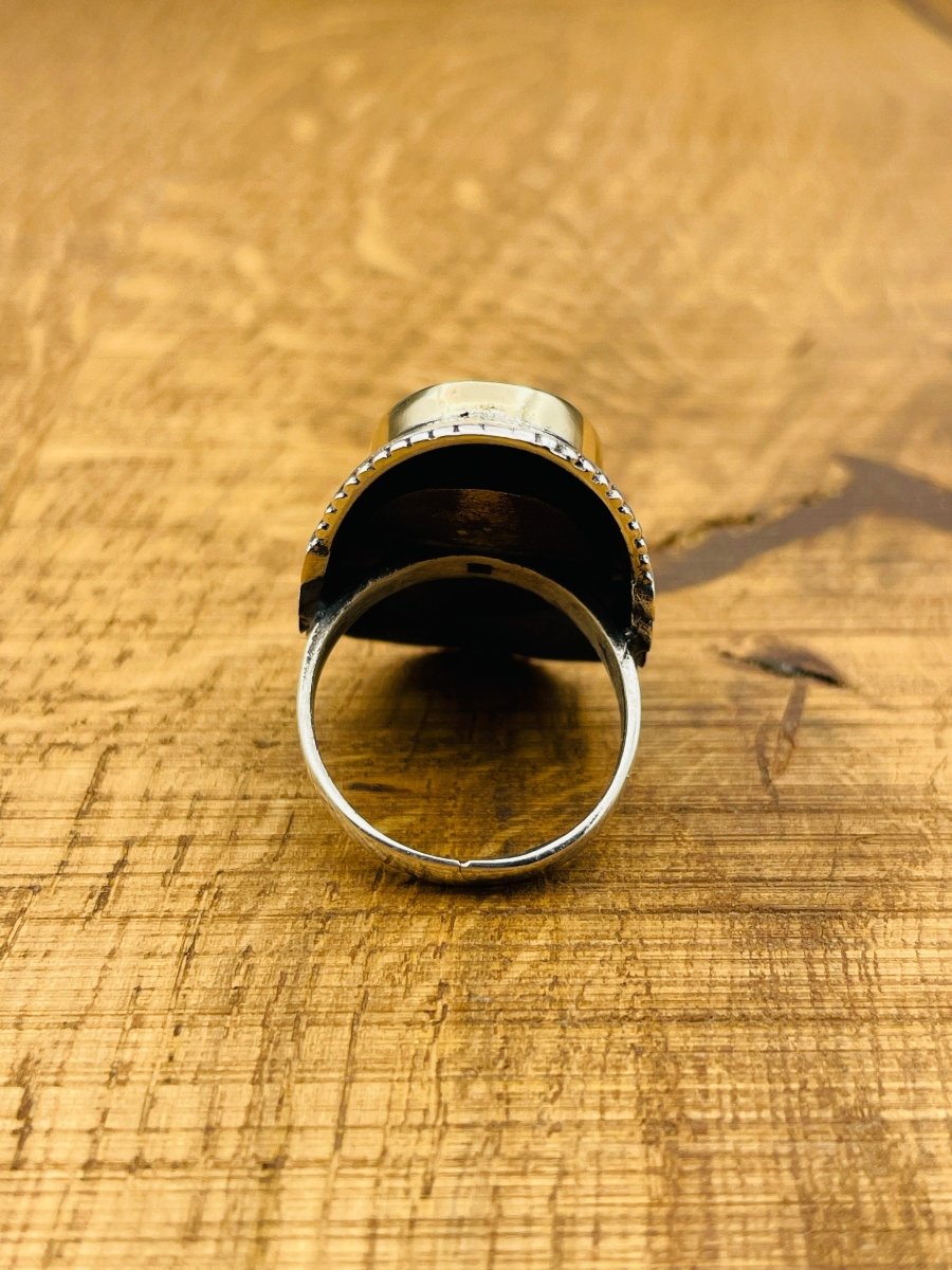 يتميز هذا الخاتم الرائع بحجر ياقوت بيضاوي كبير مذهل، موضوع ضمن تصميم مستوحى من الطراز العثماني يأخذك إلى عصور الإمبراطوريات القديمة والفن المعقد. مصنوع بعناية من الفضة الاسترلينية 925 عالية الجودة، مما يضمن أناقة دائمة وجودة استثنائية. بحجم رأس بارز يبلغ 20مم × 30مم ووزن تقريبي 15 جرام، تقدم هذه القطعة إحساسًا فاخرًا وثقيلًا.