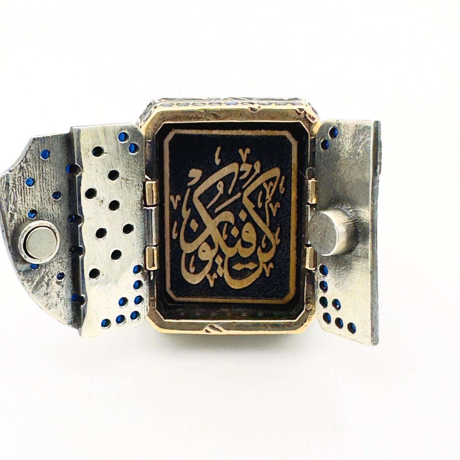 اكتشف قطعة فنية روحية استثنائية حقًا مع خاتم إسلامي تركي مصنوع يدويًا من الفضة الإسترلينية 'كن فيكون'. يجسد هذا القطعة الفريدة من المجوهرات معنى عميقًا وحرفية رائعة، مما يجعله مزيجًا مثاليًا من الإيمان والتقاليد والأناقة.