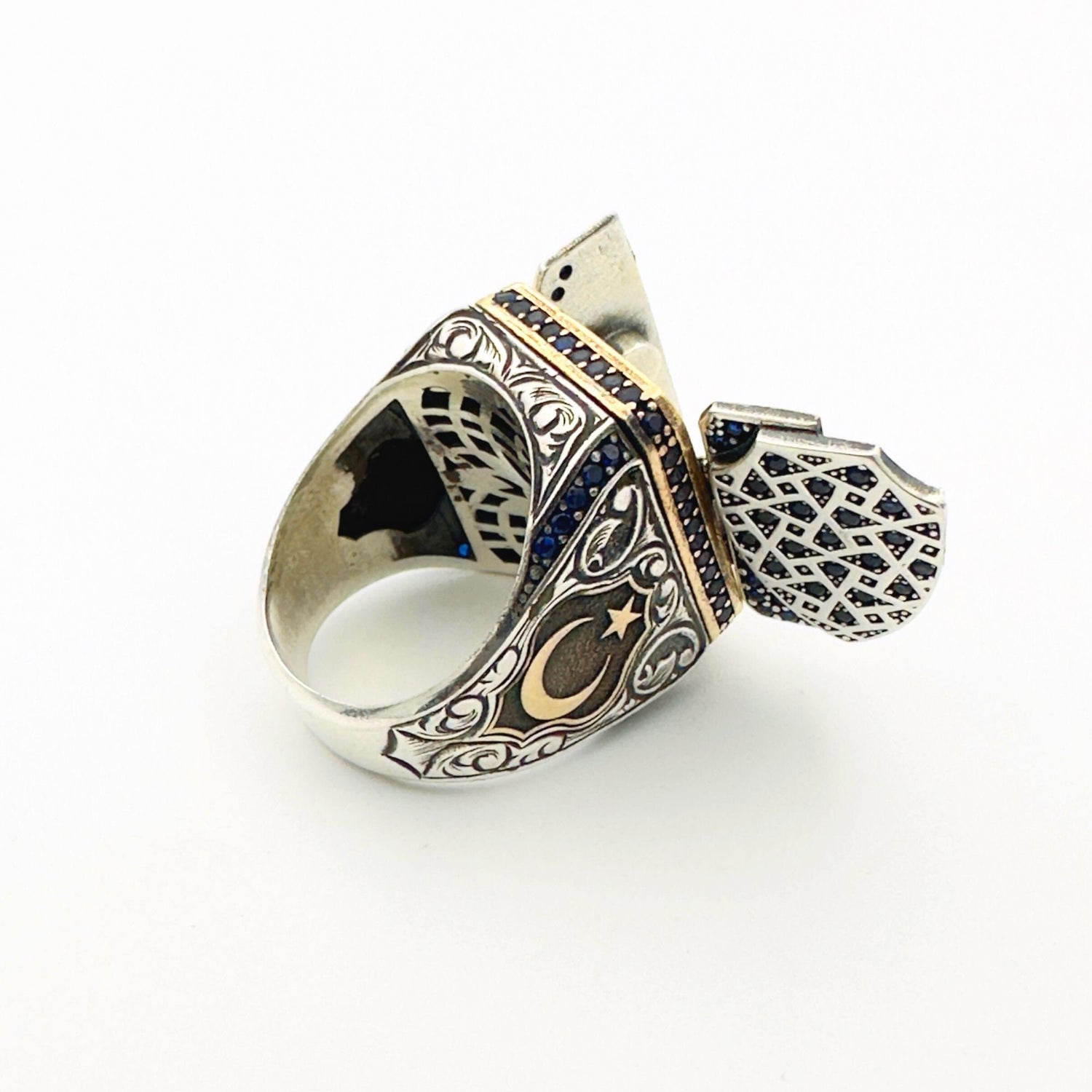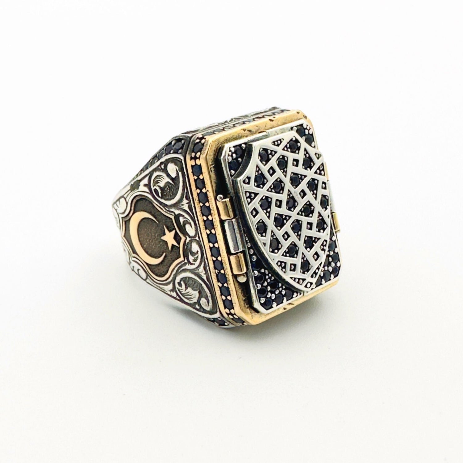 في جوهره يكمن الآية العربية القوية "كن فيكون" (كن، فيكون)، معروضة بجرأة في إطار بحجم 18x23 مم مثير للإعجاب. مصنوع من فضة إسترلينية 925 عالية الجودة، يتميز هذا الخاتم بتشطيب راقٍ ومتانة ملحوظة. يزن حوالي 24 جرامًا، مما يمنحه حضورًا قويًا لا يمكن إنكاره، ويجعل منه بيانًا حقيقيًا على أي يد. كل خاتم هو شهادة على الحرفية التركية الاستثنائية، مما يضمن جودة فريدة من نوعها.