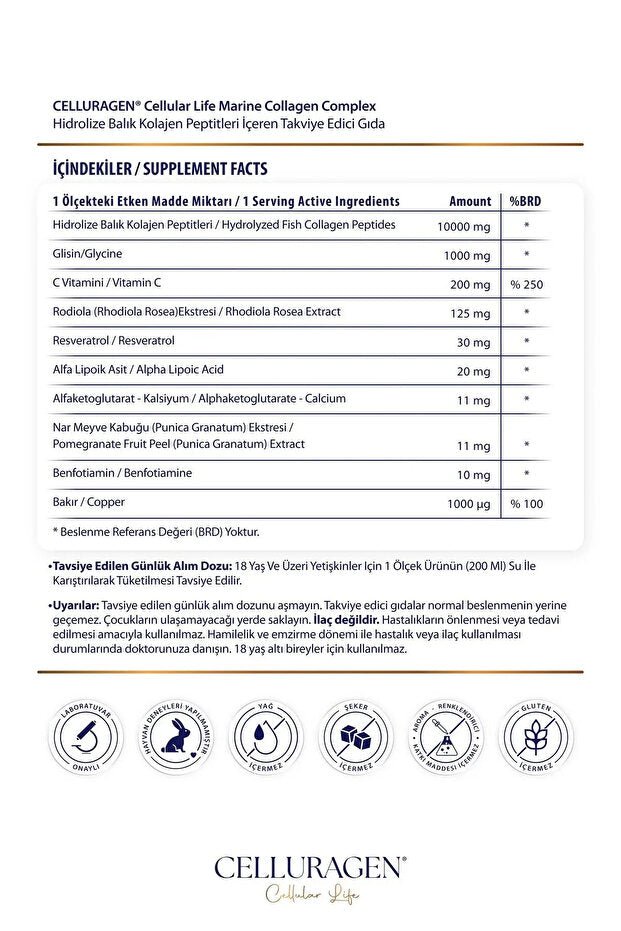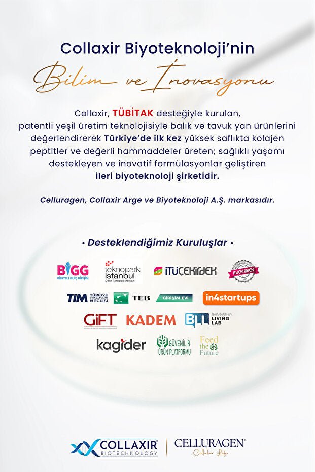 افتح إشراقتك الداخلية مع مجمع الكولاجين البحري من سيلوراجين، مكمل غذائي فاخر مصمم لدعم بشرتك وشعرك ورفاهيتك العامة. تم تطويره تحت مشروع بحث وتطوير مدعوم من TuBITAK TEYDEP، يجمع هذا التركيب المعقد بين ببتيدات كولاجين السمك المهدرج النقي مع 9 مكونات نشطة قوية.