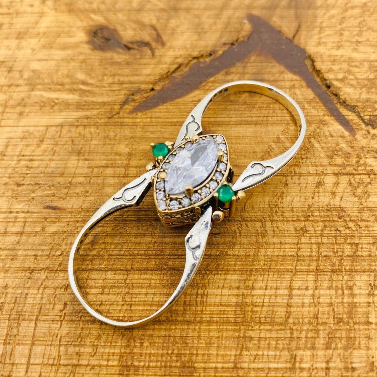 خاتم عكسي مصنوع يدويًا من الفضة الإسترلينية 925 مع أحجار الزركون الأبيض والزولتانيت - تصميم متعدد الاستخدامات اثنان في واحد لها