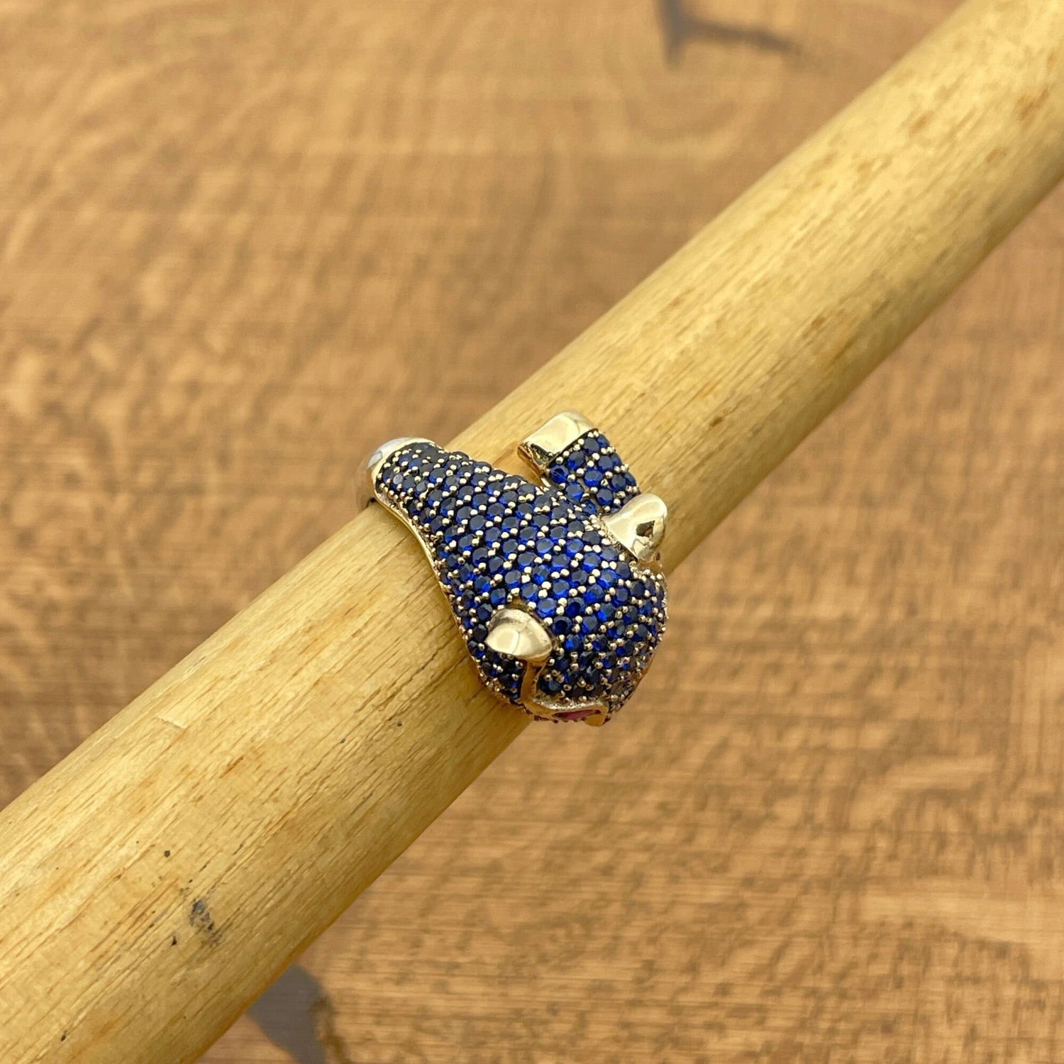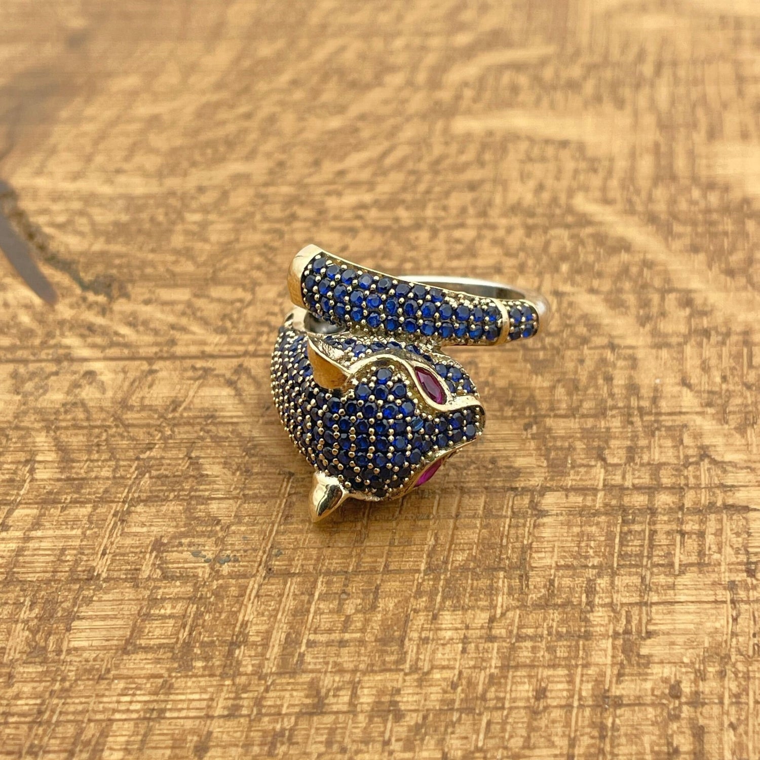 خاتم رأس نمر من الياقوت الأزرق التركي اليدوي الفاخر - مجوهرات حيوانية بيان من الفضة الإسترلينية 925