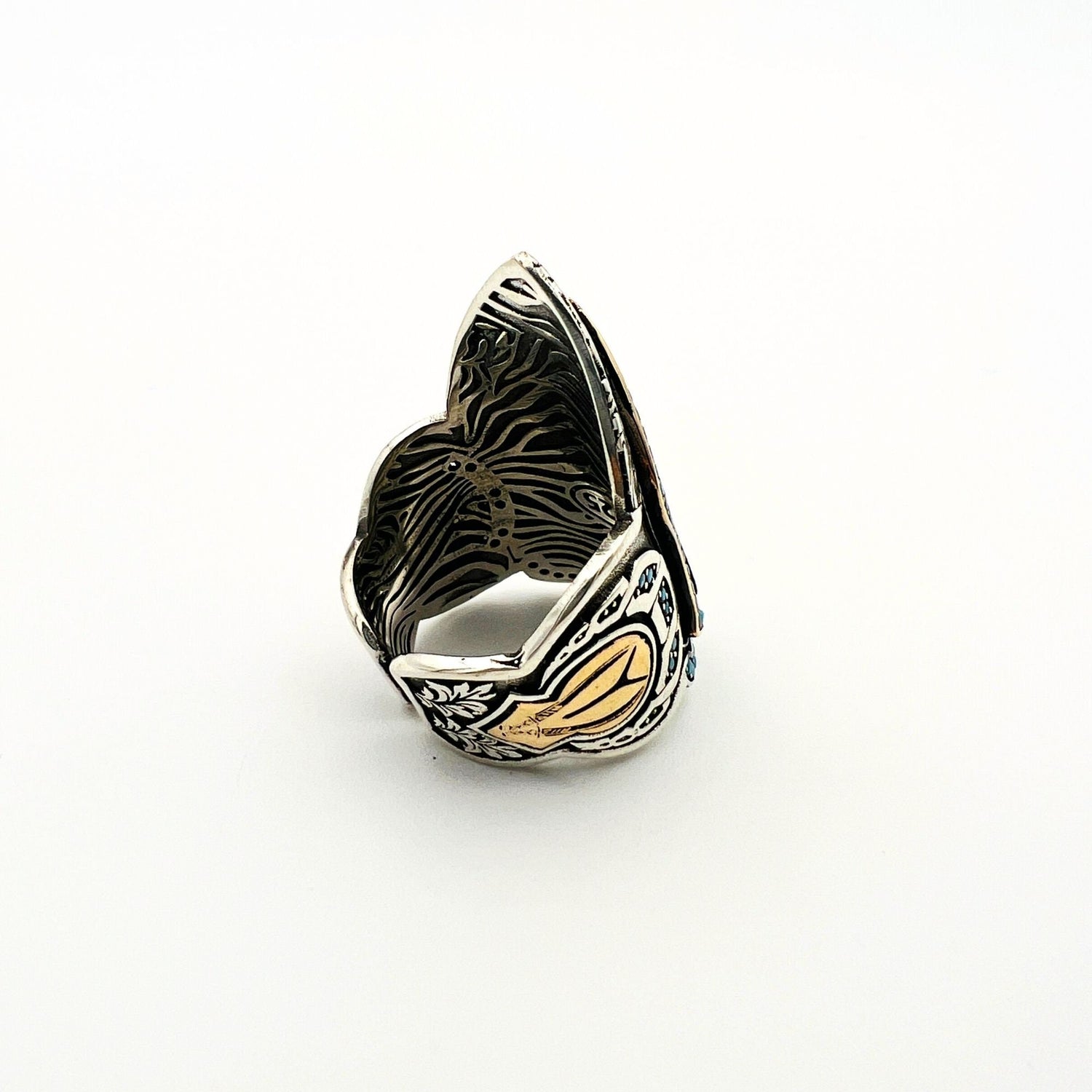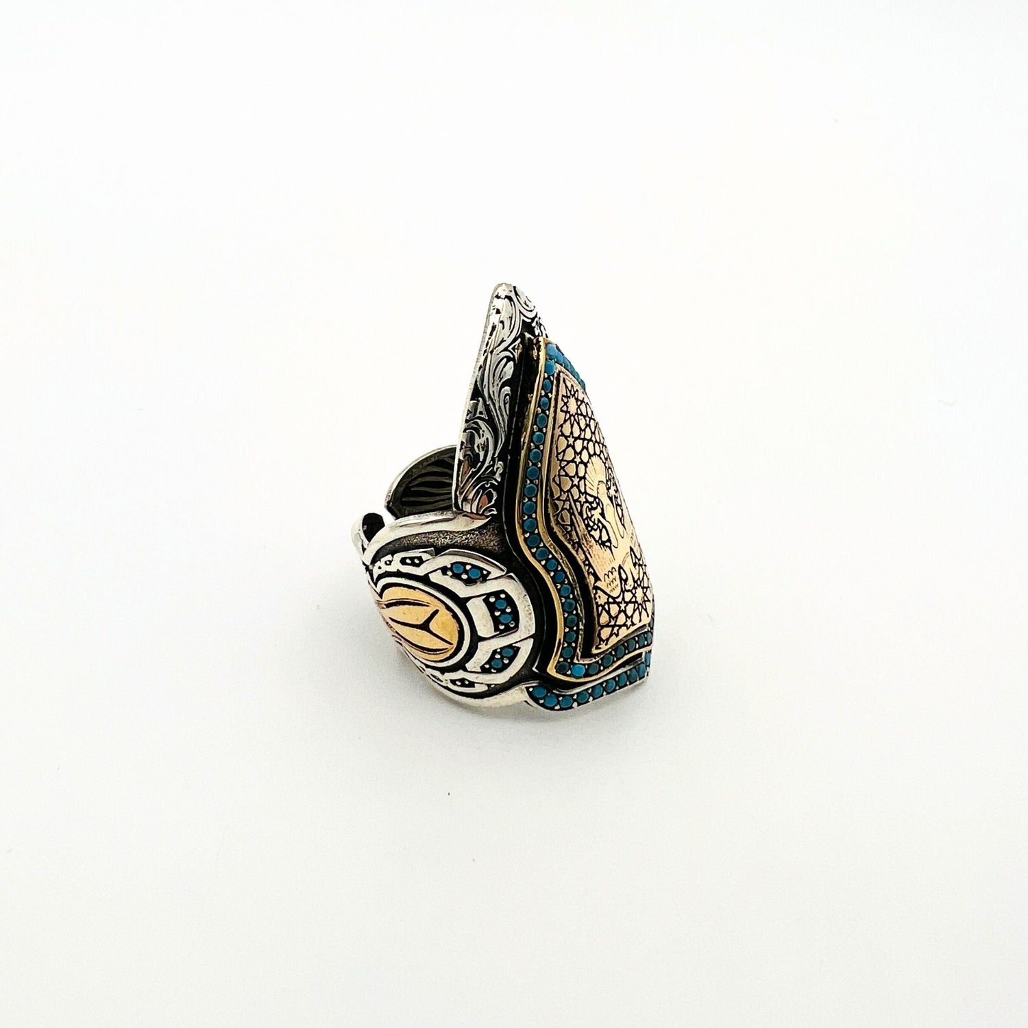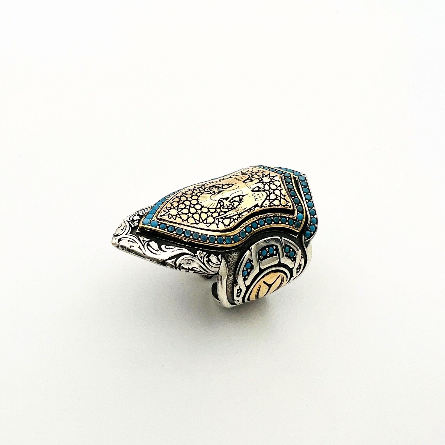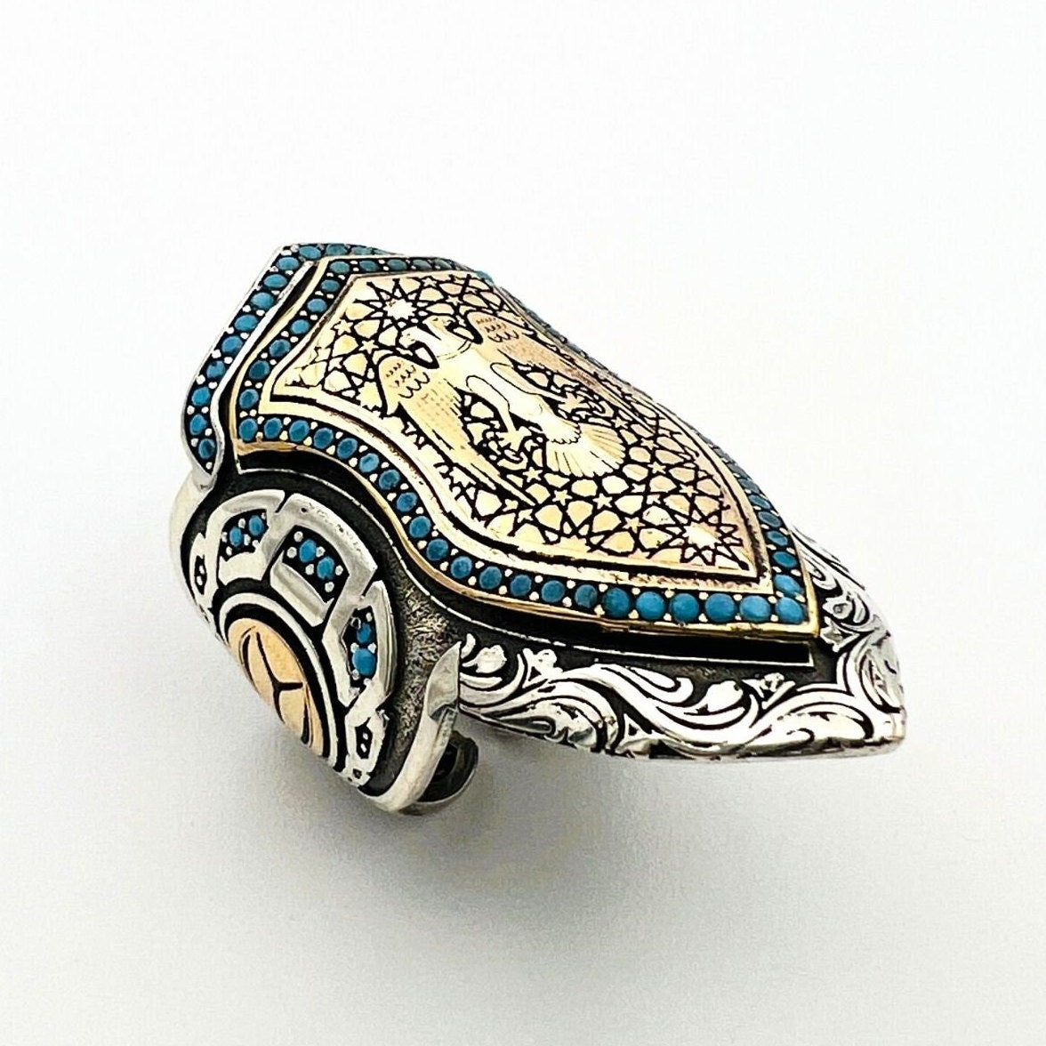 ارفع مستوى أسلوبك مع هذا الخاتم المميز ذو النسر ذو الرأسين، المصنوع يدويًا بالتقاليد التركية. احتضن سحر العثمانيين العتيق مع هذه القطعة الفريدة التي ترمز إلى القوة والتراث. سواء كهدية أو لنفسك، فإن هذا الخاتم المميز سيضفي بالتأكيد لمسة خاصة ويضيف شخصية لأي مظهر.