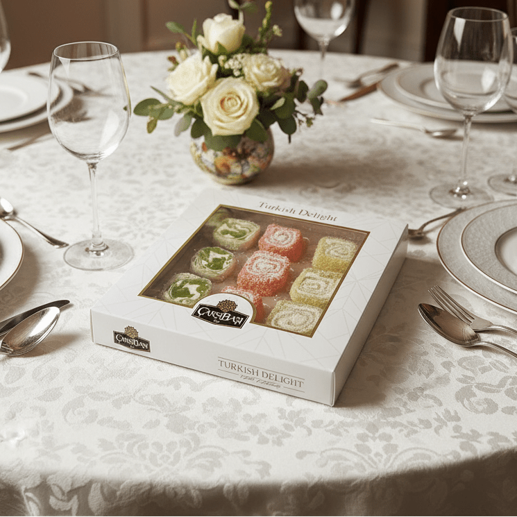 هذه ليست حلوى لوكوم عادية. كل قطعة هي حلوى على طراز 'سرما' — جيلي ناعم بنكهة الفاكهة ملفوف حول مركز كريمي ناعم. تحتوي هذه المجموعة على ثلاث نكهات حيوية، من المحتمل أن تكون تفاح أخضر/كيوي، فراولة حمراء/رمان، وليمون أصفر/برتقال، كلها مرشوشة بخفة لإضفاء لمسة نهائية مثالية.