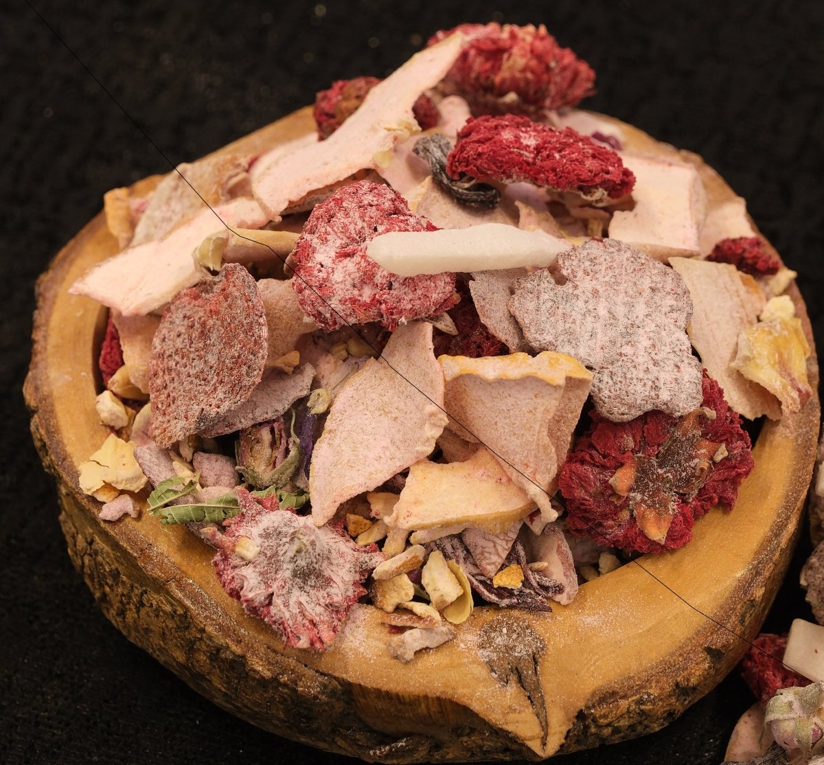 تفاح، فراولة، مانجو، أناناس، جوز الهند، تمر، رمان، زهرة الياسمين ومسحوق التوت الأسود الطبيعي