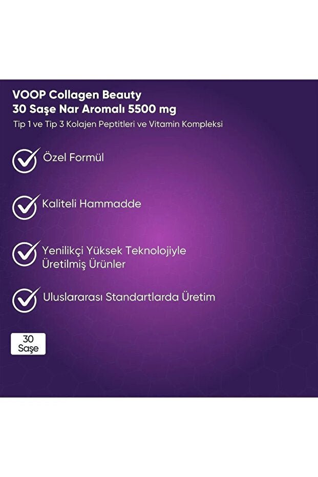 افتحي إشراقتك الطبيعية مع جمال الكولاجين من VOOP، مكمل كولاجين هيدروليكي فاخر مصمم لدعم بشرة نابضة بالحياة، وشعر قوي، وأظافر صحية. تجمع هذه التركيبة المتقدمة بين ببتيدات كولاجين الأبقار من النوع 1 والنوع 3 عالية الجودة مع مزيج قوي من الفيتامينات الأساسية والمكونات المفيدة.