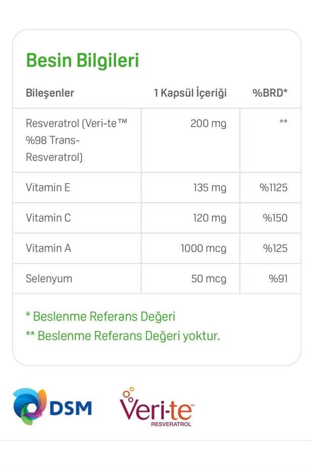 • ريسفيراترول عالي النقاء: كل كبسولة تحتوي على 200 ملغ من ريسفيراترول ترانس-ريسفيراترول النقي بنسبة 98% من Veri-te®، المعروف بخصائصه المضادة للأكسدة التي تدعم طول عمر الخلايا وصحة القلب والأوعية الدموية.