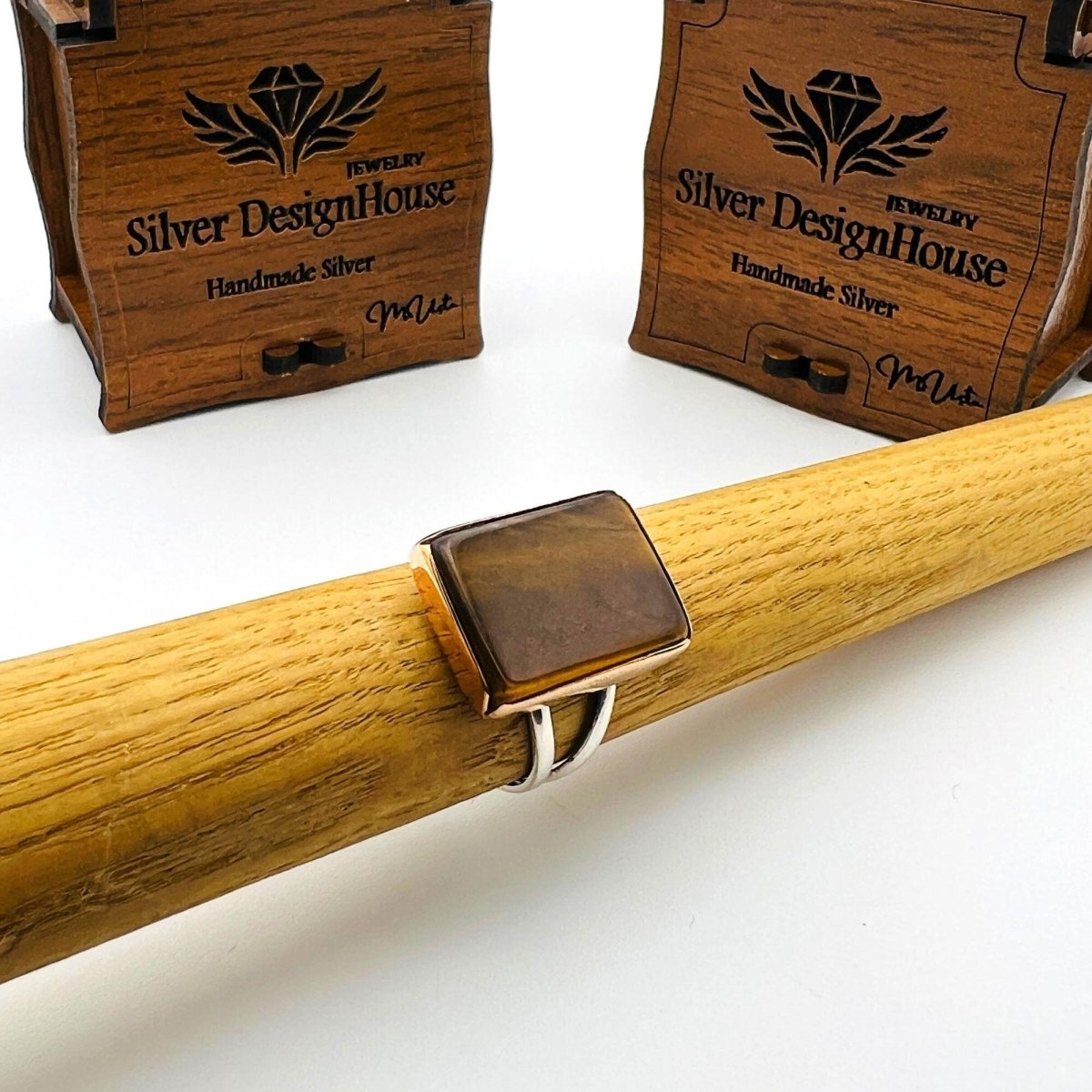 - خاتم حجر مربع أنيق يتميز بحجر عين النمر البني
