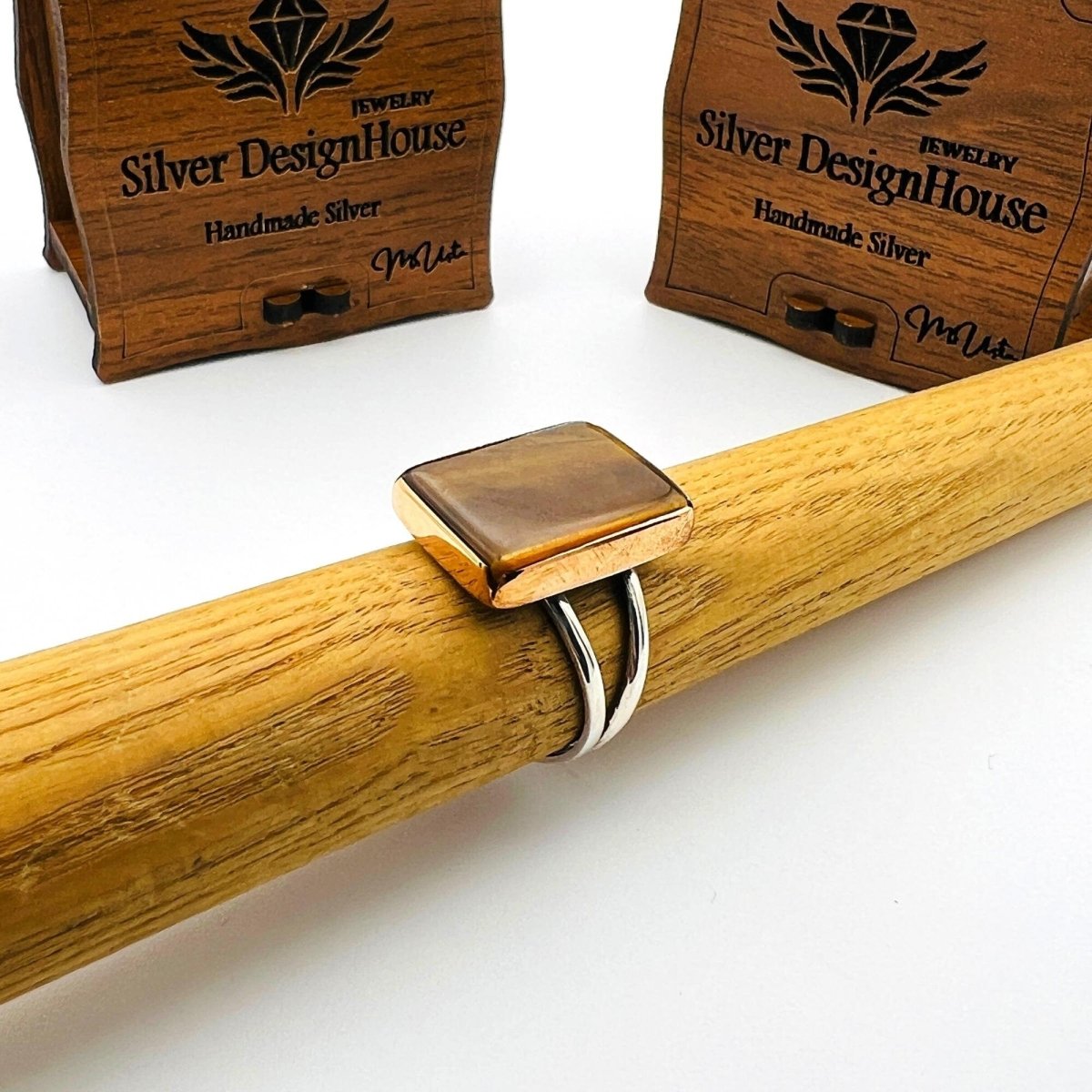 خاتم نسائي بحجر عين النمر البني - مجوهرات نسائية تركية يدوية من الفضة الإسترلينية 925k العتيقة