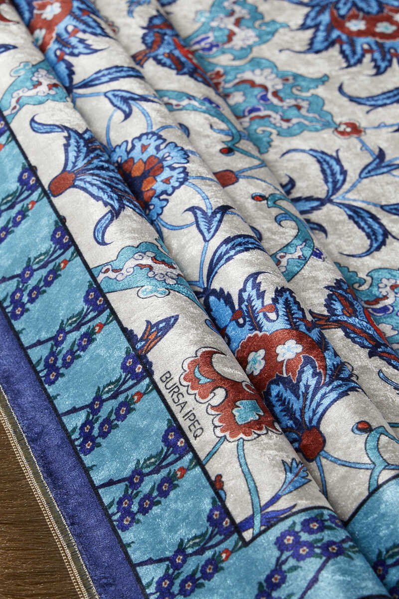عزز ديكور منزلك بجمال Bursa Ipek – اطلب الآن سجادة صلاة من المخمل الأزرق الداكن!