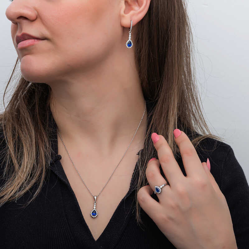 طقم مجوهرات - فضة استرلينية بتصميم دمعة من الزركون الأزرق