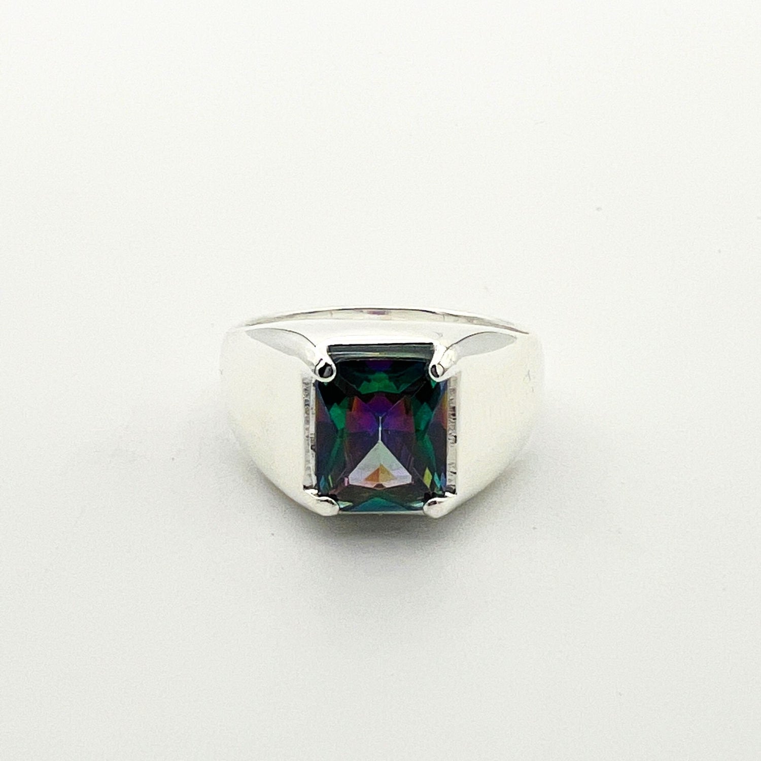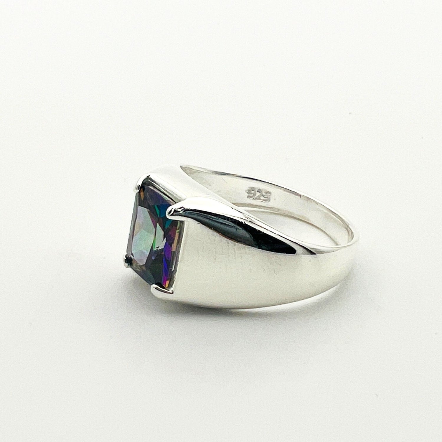 Feel the substantial weight and smooth finish of pure sterling silver, complemented by the dazzling spectacle of the Mystic Topaz. This ring isn't just an accessory; it's an expression of individuality and refined taste, designed to be admired and cherished.