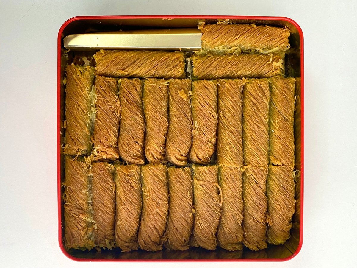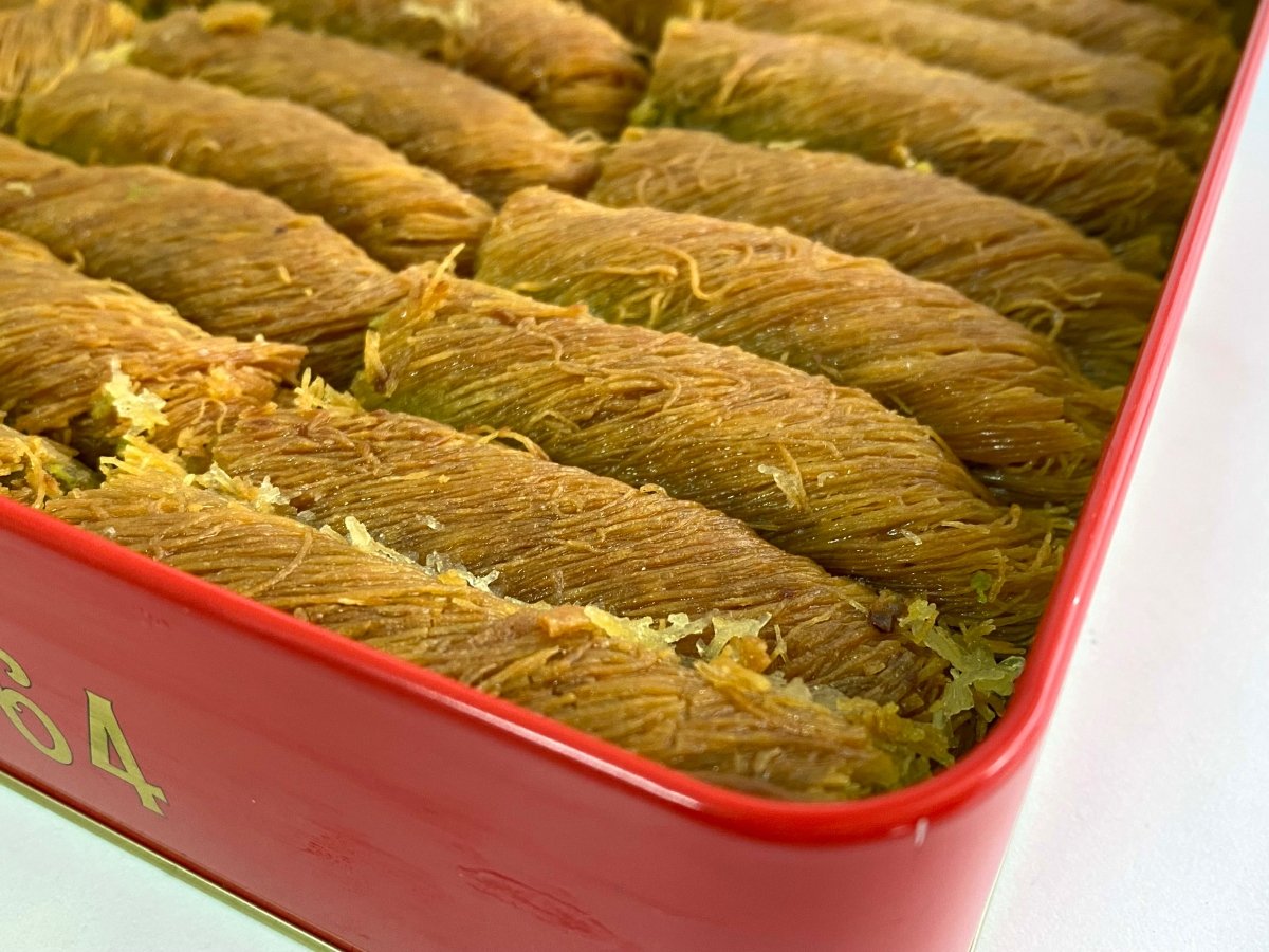 The Burma Kadayif with Pistachio is made of shredded phyllo pastry dough which is wrapped in layers around a generous amount of chopped Turkish pistachios, baked in the oven, and finished with sweet syrup.