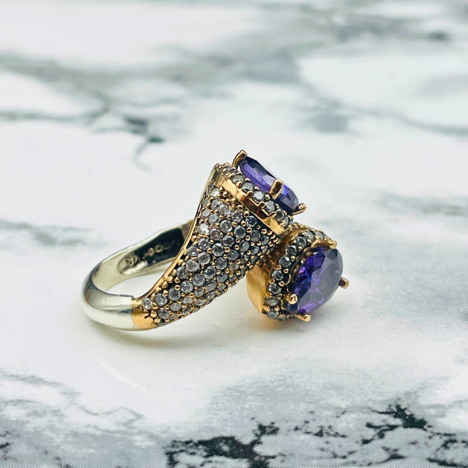 Exquisite Turkish Handmade 925K Sterling Silver Purple Amethyst Double Stone Ring