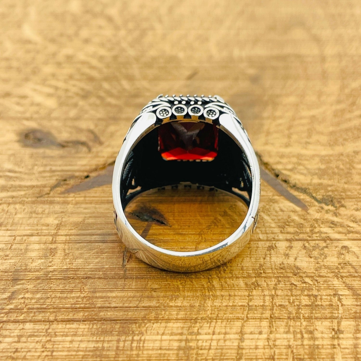 Each ring is meticulously handmade with authentic Turkish craftsmanship, ensuring no two pieces are exactly alike. It features a striking square red ruby gemstone, set within a robust band of premium 925 sterling silver. With impressive head dimensions of 15 x 18 mm and a substantial weight of approximately 11.5 ± grams, this ring exudes quality and presence.