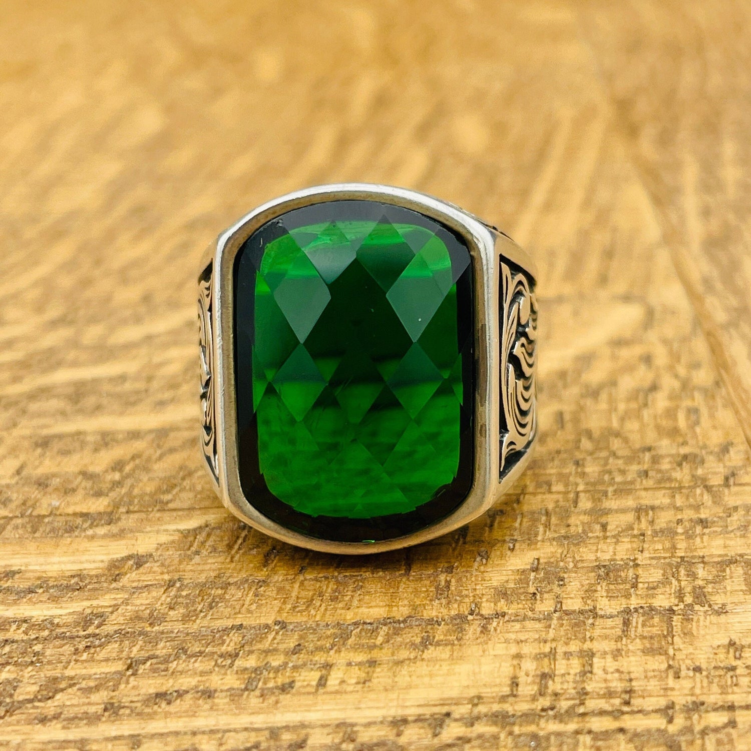 Turkish Handmade Men's 925 Sterling Silver Ring | Square Green Zircon Stone | Thoughtful Gift for Him