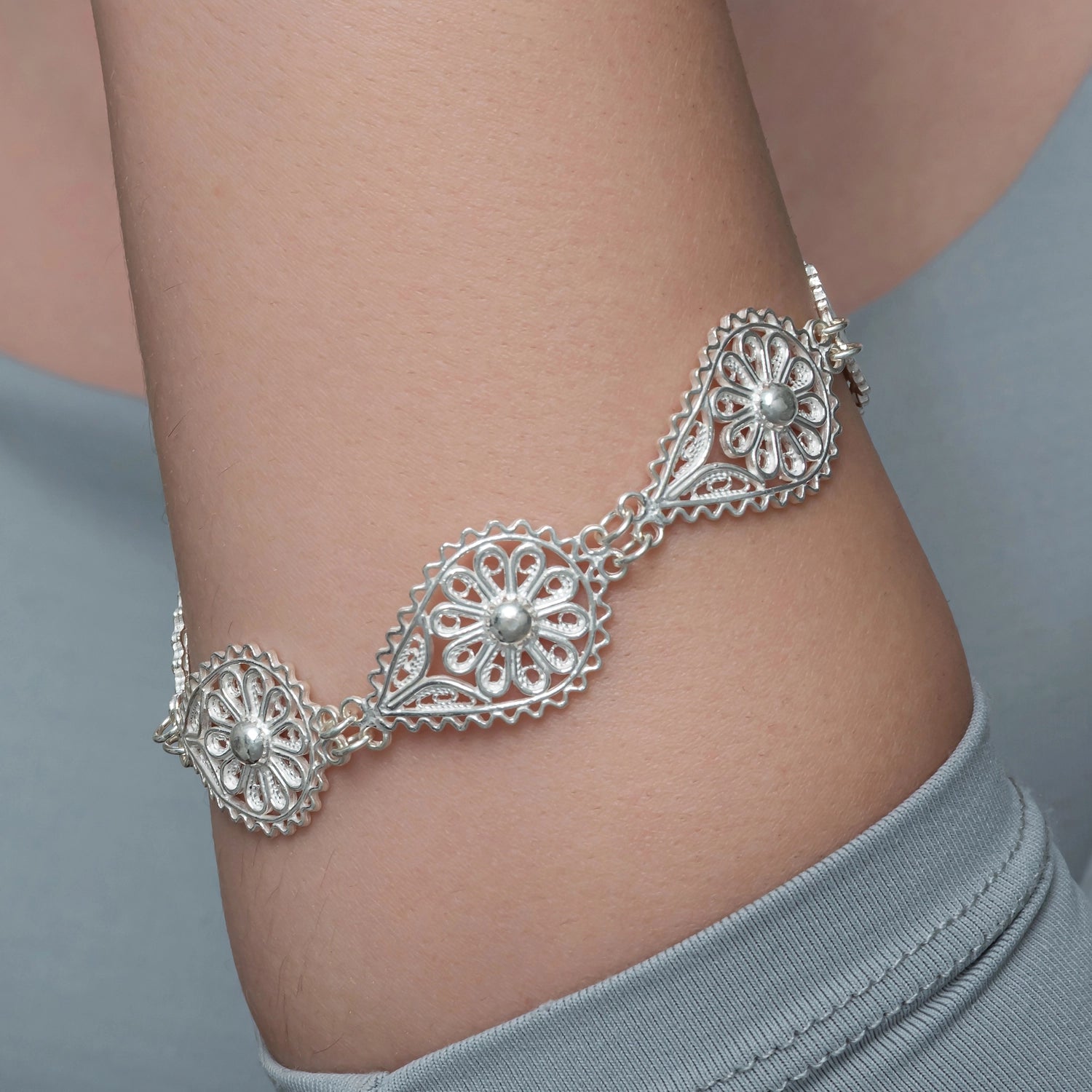 Embrace timeless elegance with our exquisite Sterling Silver Filigree Daisy Teardrop Bracelet, a true testament to artisanal craftsmanship. This stunning piece blends traditional artistry with contemporary charm, making it a captivating addition to any jewelry collection.