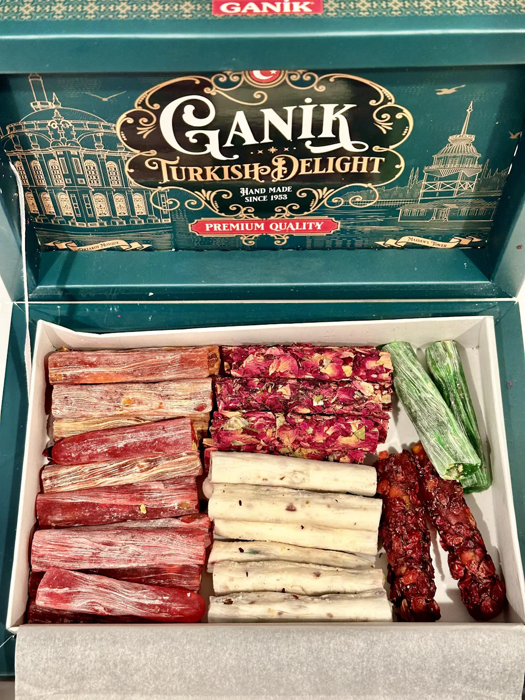 Zutaten: Antep-Pistazien, Pistazienpulver, Granatapfel, Orange, Honig, Kiwi, Zucker, Maisstärke, Zitronensalz, Wasser