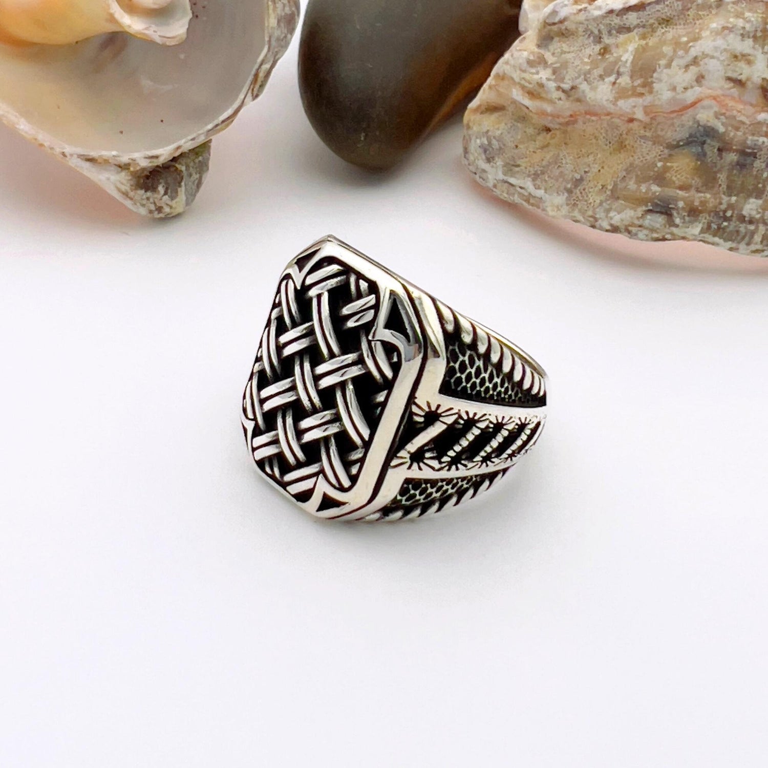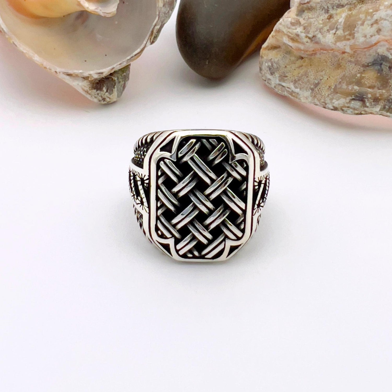 - Turkish handmade men's ring featuring a unique square knitting pattern