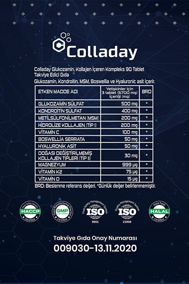 Each box contains 90 tablets, providing a convenient supply. Colladay is committed to quality, as evidenced by its ISO, GMP, HACCP, and HALAL certifications. Invest in your body's foundation and embrace a more active, comfortable life with Colladay.