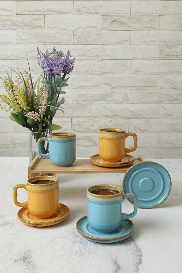 Keramika Premium Shizen Turkish Coffee Set - Yellow & Turquoise - 8 Piece Set