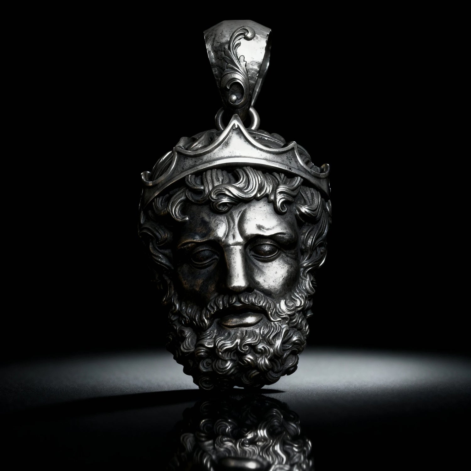This intricately designed necklace features a striking pendant inspired by the mythical god of the sea, Poseidon. Crafted with precision, it embodies strength and sophistication, making it a standout addition to any jewelry display or fashion accessories line.