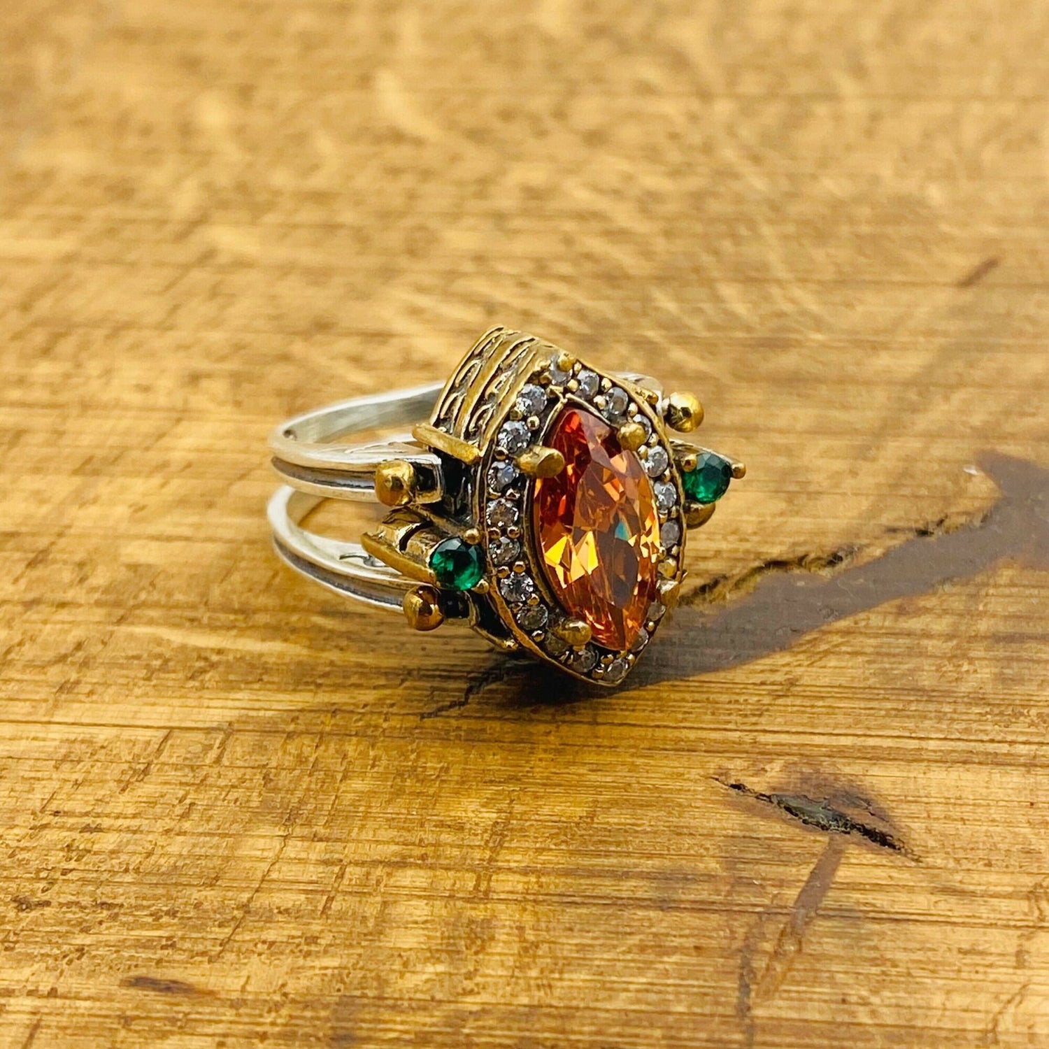 Experience the masterful artistry of a ring fashioned from premium 925 sterling silver, ensuring a timeless luster and enduring quality. This ingenious design features two captivating gemstones: the radiant warmth of Citrine, known for its joyful energy, and the deep, protective allure of Onyx. Weighing approximately 9 ± grams (size-dependent), this substantial yet comfortable piece transitions effortlessly from day to night.