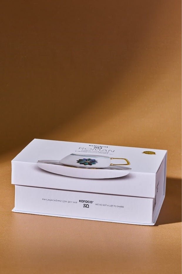 Each 90ml cup and saucer is meticulously crafted by Karaca, renowned for quality and aesthetic appeal. The Roman design features subtle elegance, making every sip a luxurious experience.