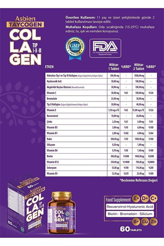 Asbien Taycogen Collagen is a high-quality food supplement, proudly produced in Turkey under GMP standards. It's not a medicine, but a daily boost for your beauty and well-being. Simply take the recommended dosage daily to support your vibrant lifestyle.