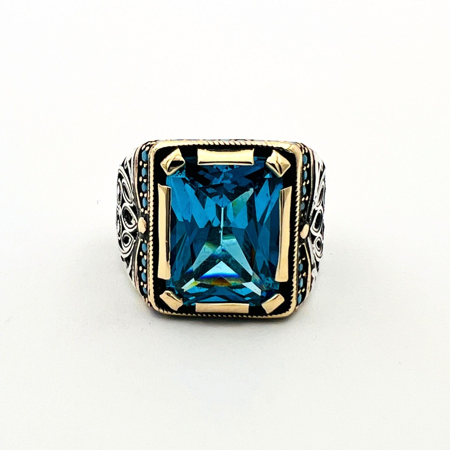 Mens Aquamarine Blue Stone Ring - Turkish Handmade 925k Sterling Silver